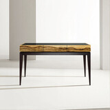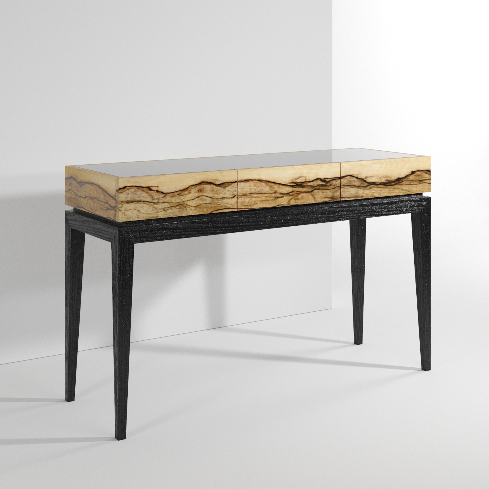 Консоль в современном американском стиле с отделкой натуральным шпоном Блэк офрам и контрастной стеклянной столешницей черного цвета. Изящное чёрное основание из массива ясеня подчеркивает красоту природной текстуры Блэк офрам. Материалы: МДФ, шпон блэк офрам, бесцветное минеральное масло; основание - массив ясеня, полуглянцевый черный лак; ящики - массив ясеня, бесцветное минералное масло; столешница - стекло лакобель черный. Фурнитура - направляющие с механизмом tip-on. Конфигурация: 3 ящика. Изделие поставляется в собранном виде.