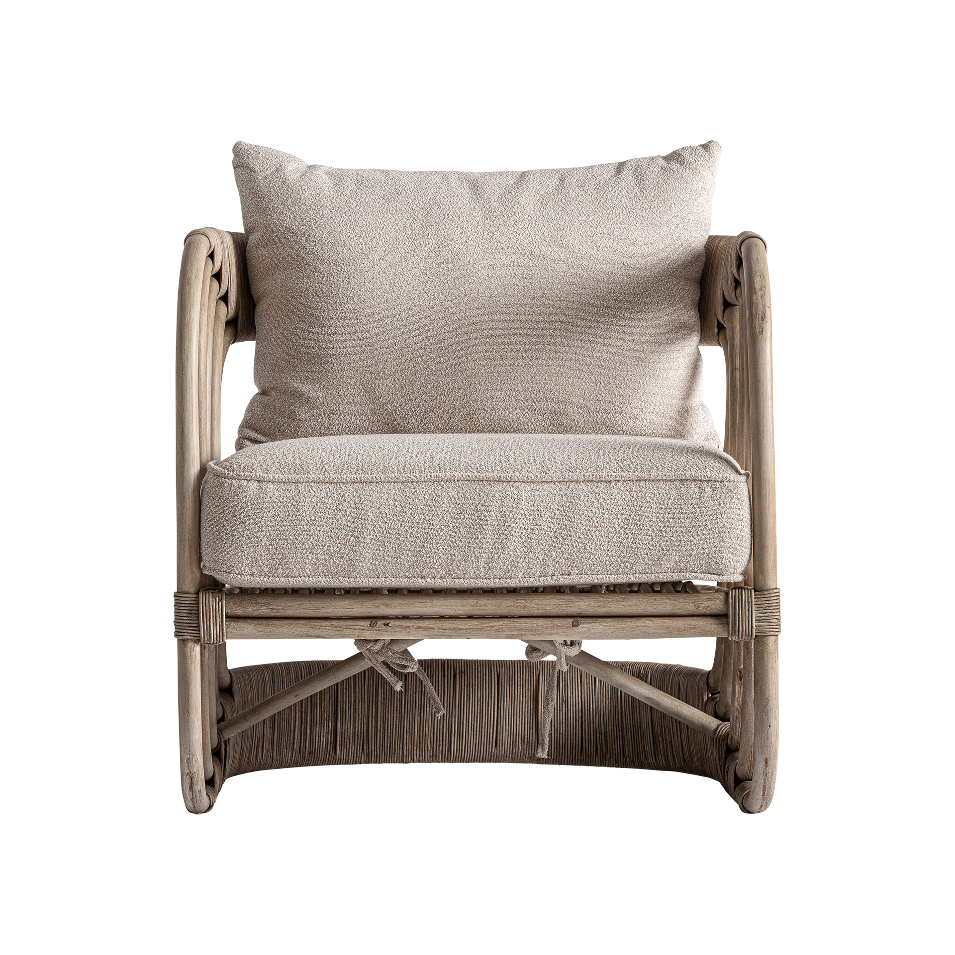 Кресло, изготовленное из бежевого полиэстера в сочетании с коричневым ротангом и пенополиуретаном. Ширина: 66 см, Глубина: 70 см, Высота: 76 см