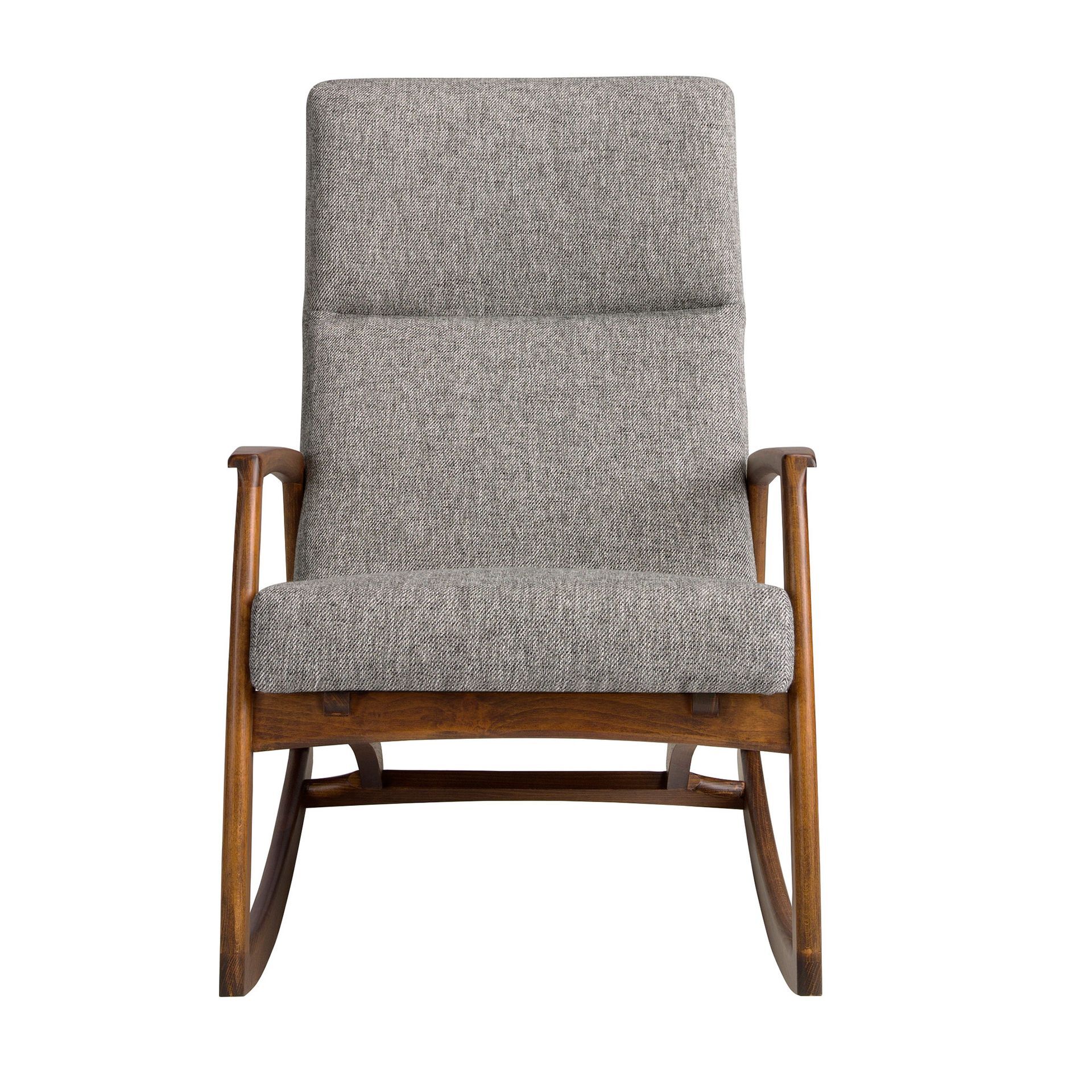 Кресло-качалка с подлокотниками современного дизайна, обитыми серой тканью. Кресло-качалка в авангардном, но неподвластном времени стиле, со структурой и ножками из дерева орехового цвета, которое станет обязательным атрибутом в вашей столовой. Ткань - TS-SW.Gris03.