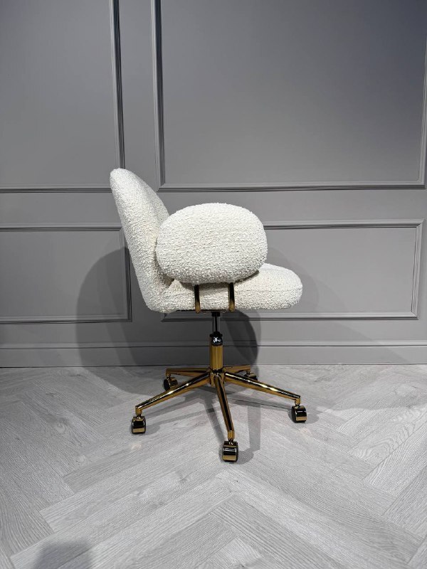 Кресло офисное Клауд-2 DR-1252-A-OF — это воплощение современного уюта, функциональности и эстетики. Это не просто мебель для работы — это офисное дизайнерское кресло, которое становится центральным элементом интерьера домашнего кабинета, гостиной или рабочей зоны в спальне. Сиденье и спинка выполнены из белой ткани букле — одного из главных трендов современного дизайна интерьеров. Букле придает изделию текстурную глубину, тактильную мягкость и ощущение роскоши. Материал устойчив к износу, не теряет формы со временем и легко сочетается как с минималистичными, так и с гламурными поверхностями. Это мягкое офисное кресло со спинкой и подлокотниками обеспечивает высокий уровень комфорта даже при длительном сидении. Спинка повторяет естественный изгиб тела, подлокотники мягкие и удобно расположены — вы можете расслабиться после напряженного дня. Кресло оснащено системой газлифт, что позволяет плавно регулировать высоту сиденья под любой тип стола. Кроме того, оно вращается на 360° и установлено на прочные колесики, обеспечивающие легкое передвижение по полу без царапин. База выполнена в виде металлической ножки из нержавеющей стали, покрытой глянцевым золотом методом гальваники — технологичного и долговечного решения. Гальваническое напыление устойчиво к коррозии, не тускнеет и сохраняет блеск на протяжении многих лет. Золотистая ножка контрастирует с белым букле, создавая эффект гламурной элегантности. Это офисное кресло на колесиках идеально подходит для домашнего офиса, уголка для чтения, рабочей зоны в гостиной или спальне. Благодаря продуманному дизайну и высокому качеству материалов, кресло станет долгосрочным решением для тех, кто ценит сочетание стиля, комфорта и индивидуальности. На колесиках, крутящееся на 360гр, система газлифт. Цвет: молочный Ширина: 65см Глубина: 63см Высота: 89см Ширина сиденья: 48см Глубина сиденья: 48см Высота сиденья (нижнее положение): 49см Высота сиденья (верхнее положение): 59см Толщина мягкого блока: 8см Высота спинки: 43см Вес нетто: 12,5кг Вес брутто: 13,5кг 1шт/1кор Объем: 0,380 Гарантия 1 год