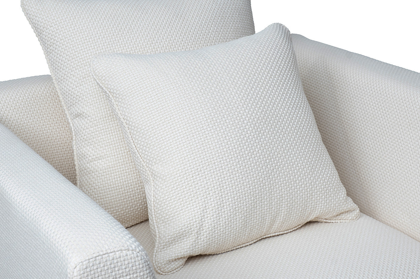 Необыкновенно стильное кресло, обитое плотной тканью рогожка кремового цвета, станет украшением гостиной, спальни или кабинета, оформленного в современном стиле. Плавные линии подлокотников, глубокое сиденье, мягкие подушки создают ощущение уюта и комфорта. Сдержанный дизайн кресла подчеркивает красоту фактуры мебельной ткани и благородство кремового оттенка. Кресло прекрасно сочетается с креслом в том же стиле, создавая гармоничное пространство для отдыха и релакса. Габариты сиденья: длина 66см, глубина 67см, высота от пола 48см. В комплекте - подушка спинки 60*60см - 1шт и подушка декоративная 50*50см - 1шт. В стандартном исполнении: обивка - рогожка BOTEGA SVBEG, цвет основания - 4.