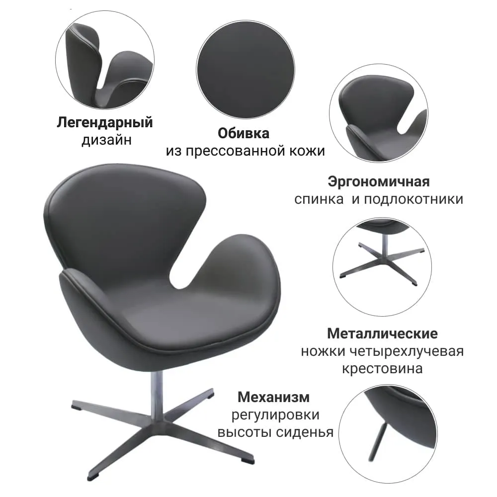 Кресло Swan воплощает главные принципы датского дизайна - соразмерность и функциональность. Это делает его одной из самых желанных моделей среди ценителей дизайнерской мебели. Кресло Swan создавалось для отелей и зон ожидания в общественных зданиях, однако сегодня нередко используется в качестве офисного кресла благодаря удобной посадке и механизму регулировке по высоте.. Реплики культового кресла выпускаются в кашемире и состаренной коже и подходят для большинства квартир, оформленных в современном стиле.