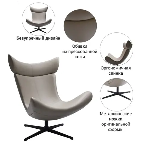 Чаша кресла обита прессованной кожей и установлена на устойчивой «четырехпалой ножке».