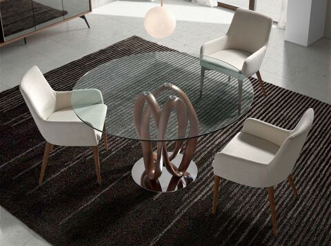 Круглый обеденный стол DT801 — уникальное творение дизайнеров фабрики Angel Cerda. Стол удивляет и восхищает одновременно. Слепленная словно из пластилина деревянная стойка бесспорно делает эту модель эксклюзивной. Ножку хочется потрогать, чтобы убедиться в ее твердости и осознать в итоге, что это изделие создавал действительно мастер своего дела. Да, такой стол — настоящая находка для современной гостиной, которой не хватает чего-то особенного. При изготовлении данной данной модели использовалось сразу три материала: сталь, стекло и дерево. Столешница сделана из закаленного ударопрочного стекла и имеет круглую форму. Отсутствие острых углов делает эксплуатацию изделия более безопасным, что важно для семей с маленькими детьми. Поддерживает столешницу стойка, сделанная из цельной гнутой древесины. Ей оставлен натуральный, светло-коричневый цвет. Для придания всей конструкции устойчивости, есть металлическая подложка, на которой закреплена дизайнерская ножка. Она имеет цвет темной хромированной стали и достаточную площадь, чтобы обеспечить нужную устойчивость. Диаметр стола составляет 130 см, а высота — 78 см. Данная модель приходит в разобранном виде, поэтому потребуется самостоятельная сборка. Крепеж и инструкция входят в комплектацию. Вес стола после соединения всех элементов составит 51 кг.