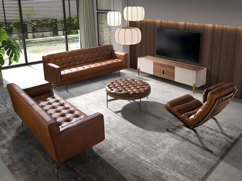 Современный круглый журнальный столик из натурального орехового шпона и элегантной темно-коричневой кожаной столешницы. Его структура из затемненных ножек из нержавеющей стали привносит нотку современности и авангарда, которую вы ищете в своем доме.