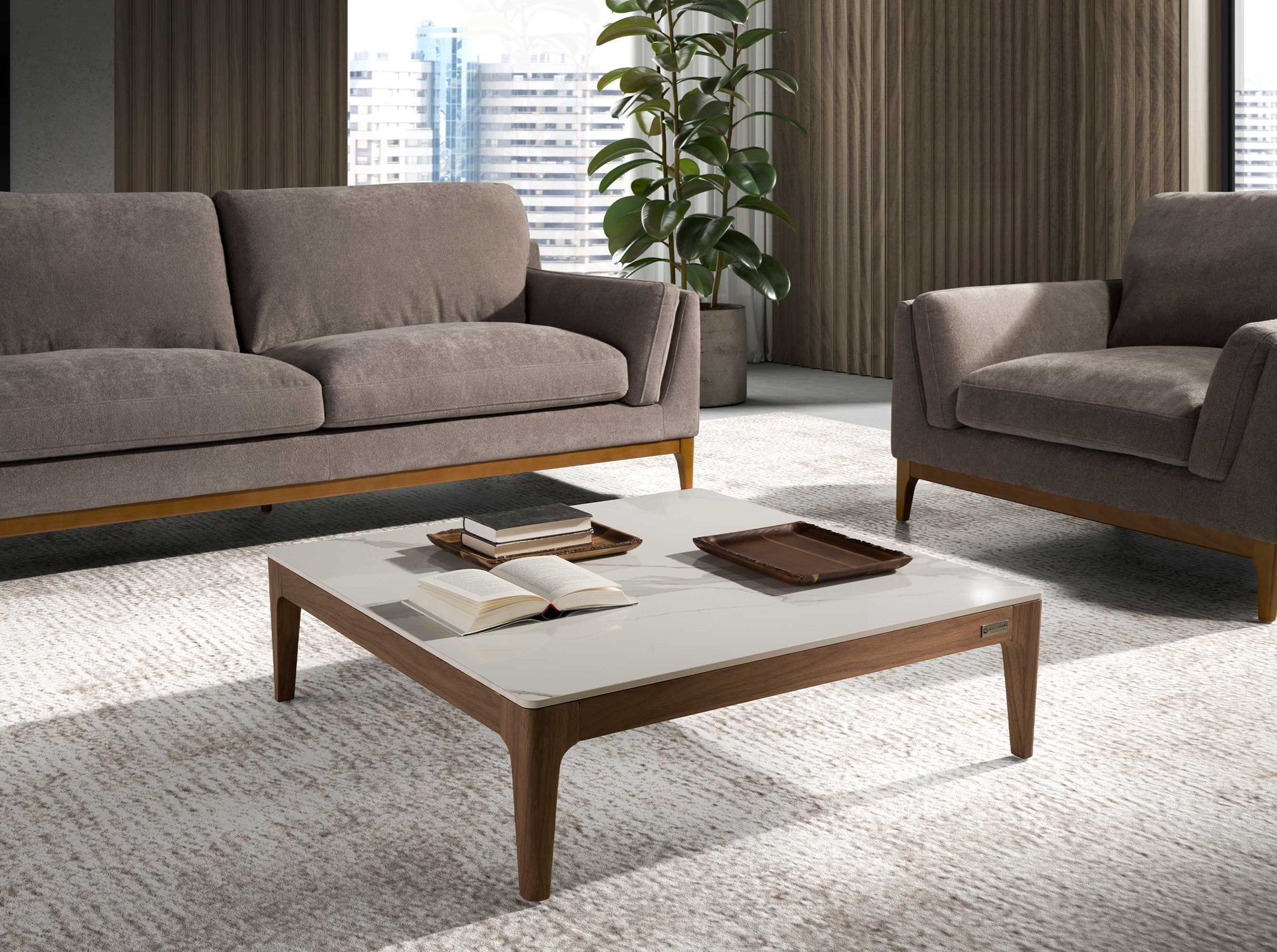Квадратный журнальный столик CT795 от фабрики Angel Cerda – когда неравнодушен к красоте мрамора. Журнальный столик CT795 очарует каждого, кто ищет мебель не только подходящую под современный интерьер, но и красивую. Мраморная столешница завораживает своим орнаментом. Она светлая, а значит, освежит интерьер. Она практичная, а значит, стол будет удобным в эксплуатации. Стол имеет квадратную форму. Столешница выполнена из керамики цвета белого мрамора. Она стойко переносит воздействие высоких температур, легко очищается от загрязнений. Опора сделана из шпонированного МДФ, оснащена четырьмя конусными ножками. Они расположены по углам, благодаря чему достигается равномерное распределение веса изделия. Орех – прочная порода дерева, поэтому стол способен выдерживать высокие весовые нагрузки. Для защиты дерева от негативного воздействия внешней среды, деревянная опора покрыта бесцветным лаком. Масса стола составляет 52 кг. Размеры: длина – 100 см, ширина – 100 см, высота – 30 см. Поставка осуществляется в разобранном виде. Для самостоятельной сборки в комплектации предусмотрен крепеж, инструкция.