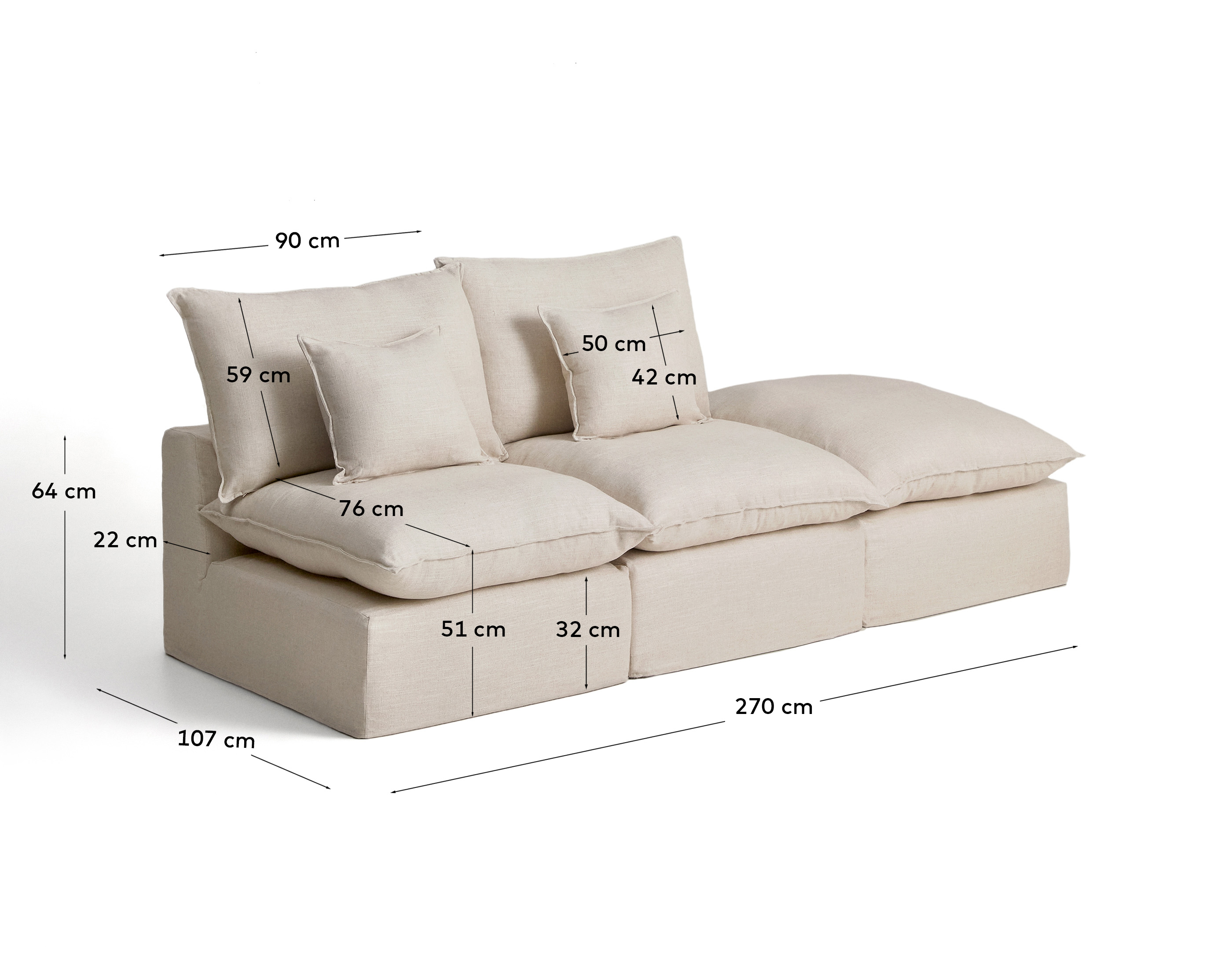 Модульный диван Anarela из бежевого льна и вискозы с торцевым модулем и съемным чехлом, 270 см