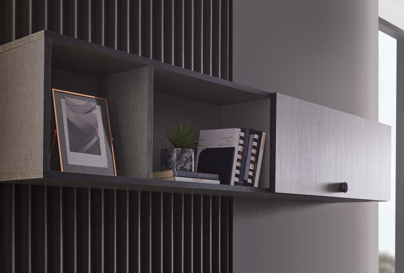 Для фасадов, боковых и задней поверхностей шкафа используется ДСП 18 мм с меланжевой серой рельефной текстурой. Полки шкафа выполнены из ДСП 18 мм темного, почти черного цвета под дерево. Ручка – металлическая, глянцевая. Дверца оснащена доводчиком.