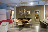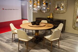 Круглый обеденный стол на фигурном основании выполнен в стиле модерн. Деревянная столешница со скошенным краем опирается на ножку из геометрических фигур из мрамора, стекла и массива дерева. Поставляется без элемента Lazy Susan в центре столешницы.