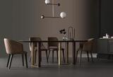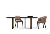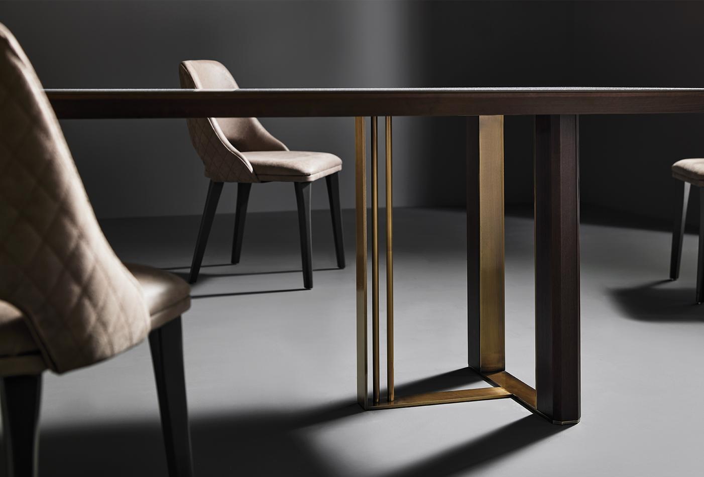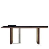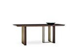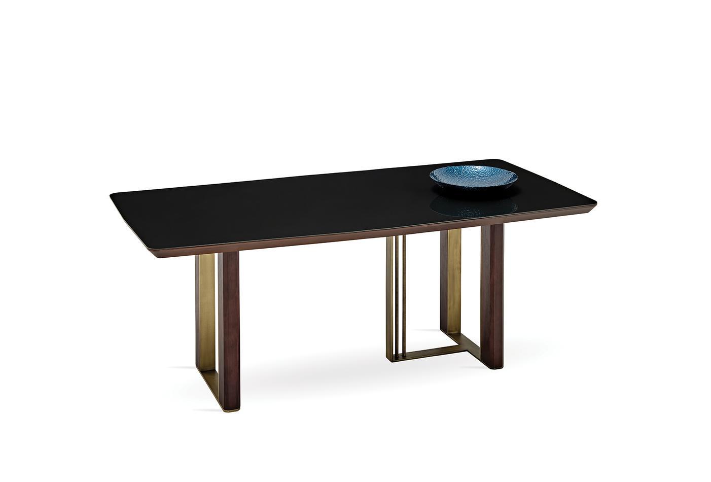 Столешница выполнена из шпонированного МДФ орехового цвета, верхняя часть поверхности – из закаленного стекла темно-серого цвета, устойчивого к повреждениям, безопасного и выдерживающего высокие нагрузки. Опора – массив и металл. Вместимость стола 6-8 человек.