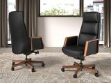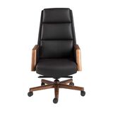 Современное поворотное офисное кресло с сиденьем и спинкой, обитыми черной искусственной кожей. Оно оснащено подлокотниками для большего комфорта. Благодаря ножкам из древесины цвета ореха и регулируемой по высоте высоте сиденью, оно станет незаменимым элементом вашего рабочего места, не жертвуя при этом самым авангардным стилем. Колесики обеспечивают дополнительную практичность, необходимую во время работы или учебы.