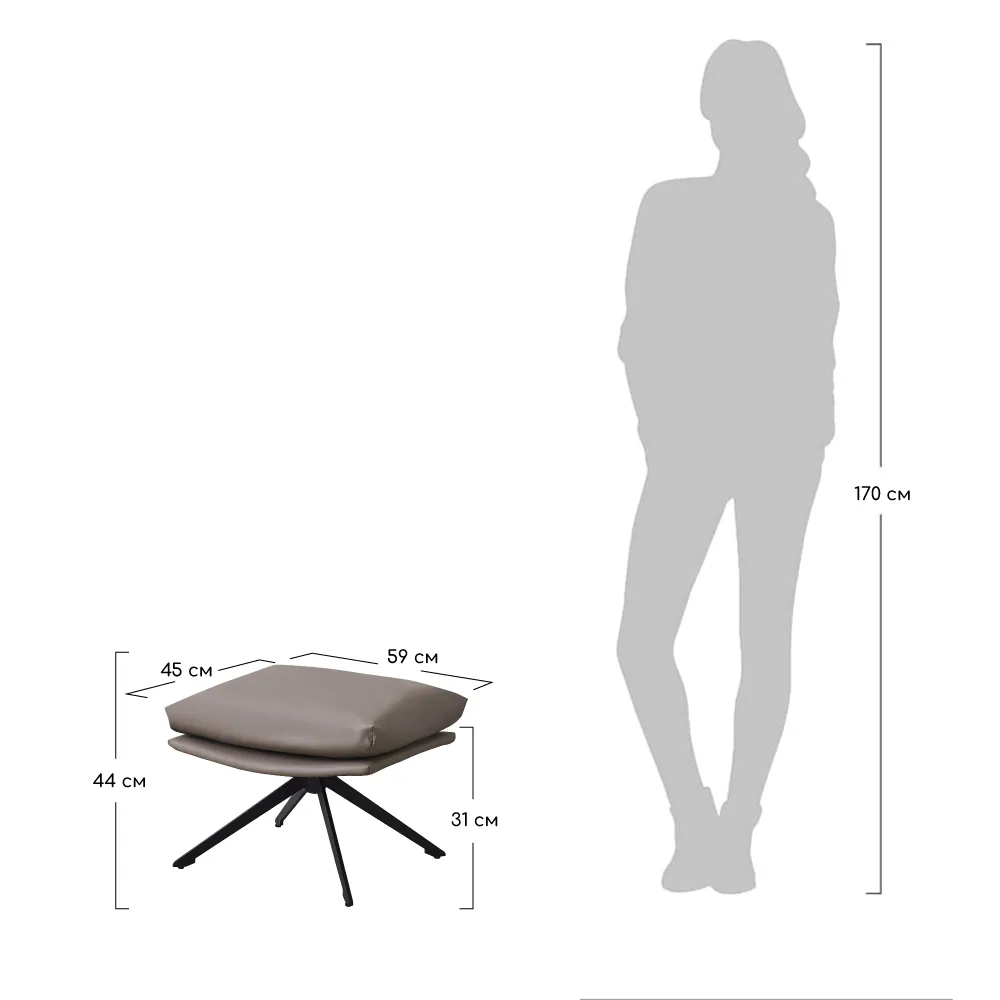 Ножки оттоманки изготовлены из прочного металла, что обеспечивает ее устойчивость и долговечность. Обивка оттоманки выполнена из мягкой и приятной на ощупь экокожи, которая выглядит стильно и современно.