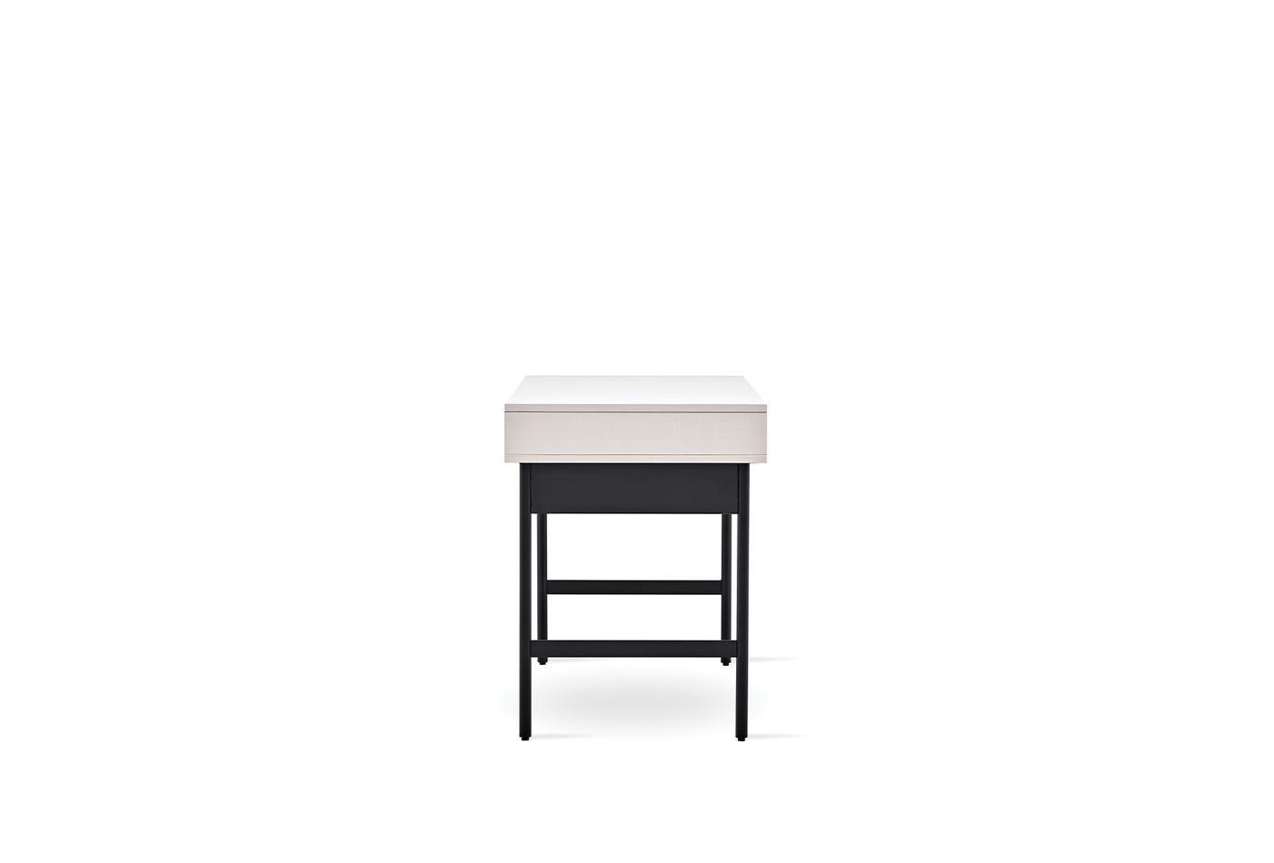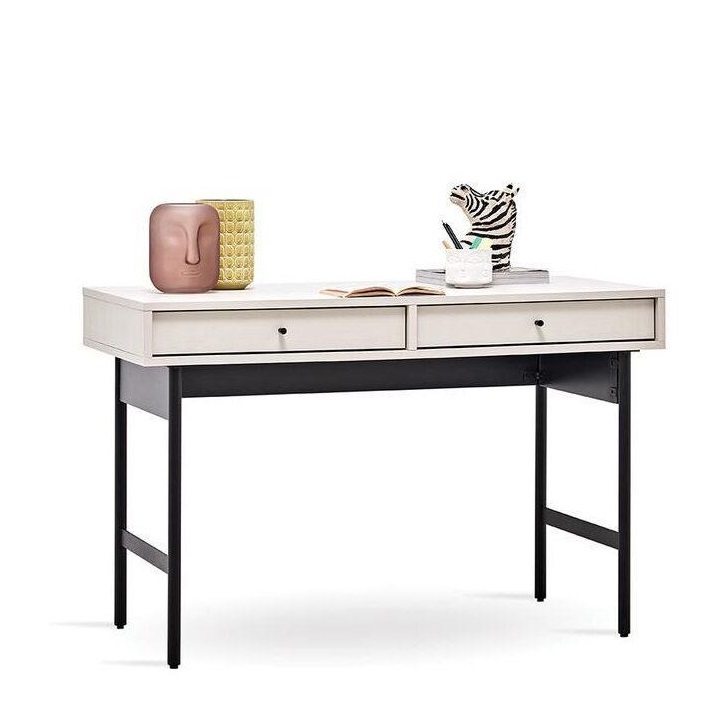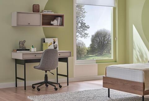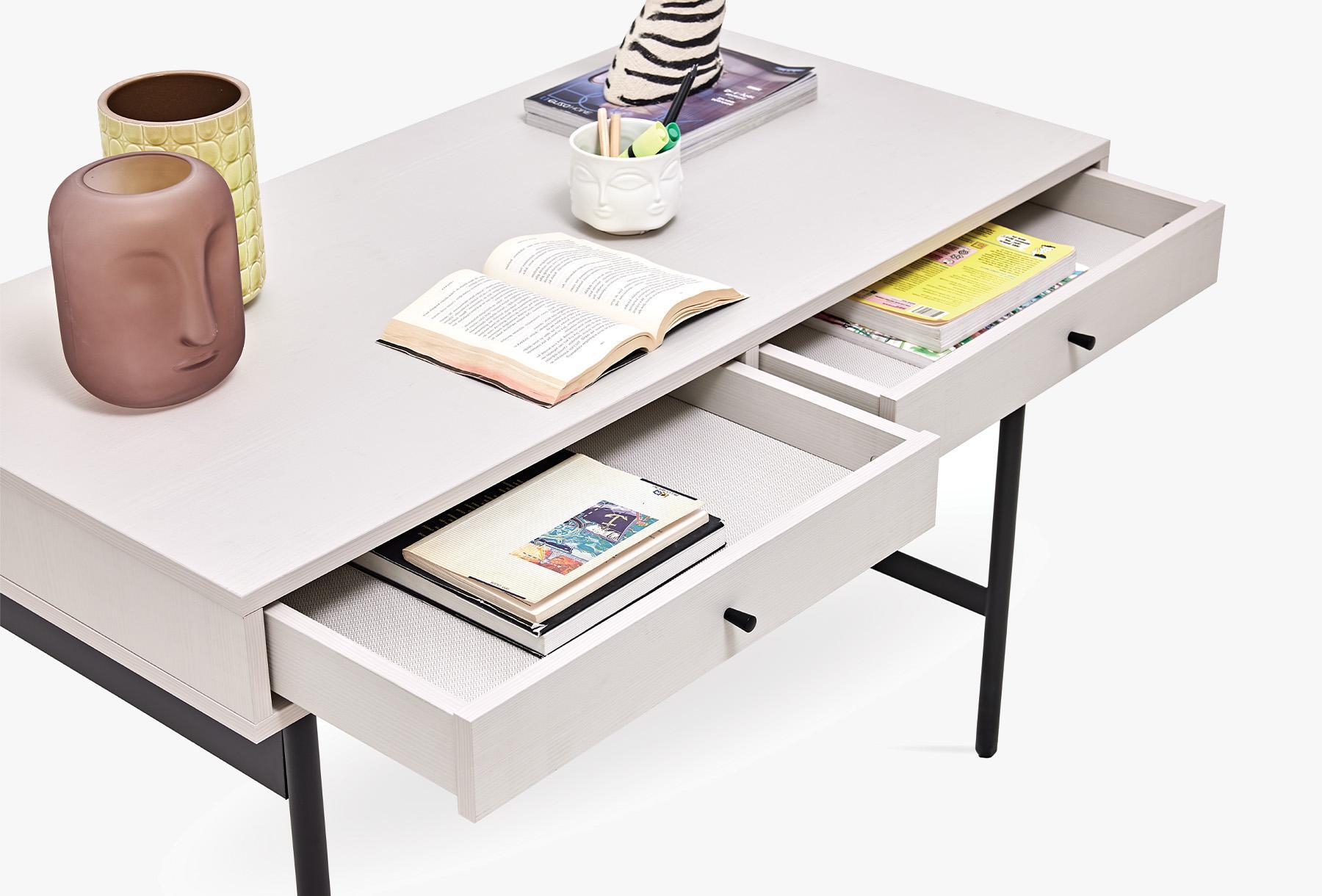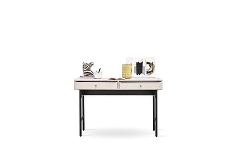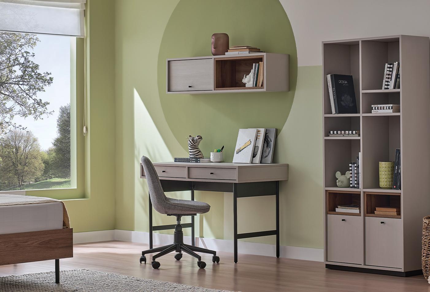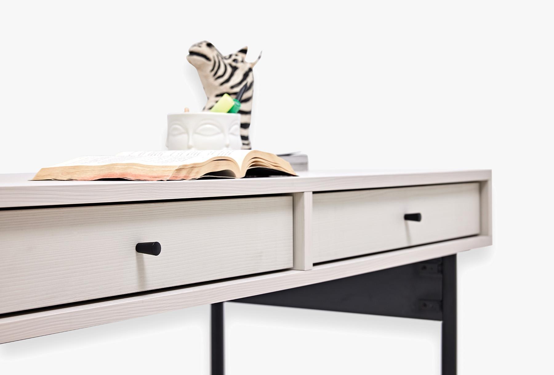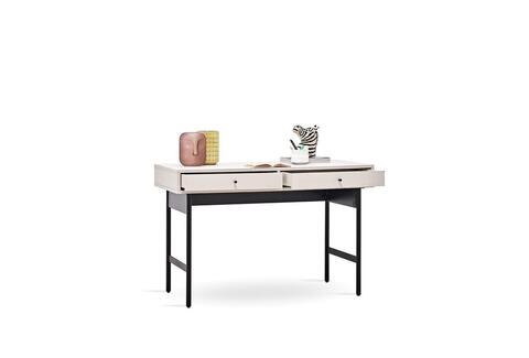 Рабочий стол отличается современным и функциональным дизайном и станет незаменимым для молодых людей. Стол выполнен в сочетании индустриального стиля и эко, дополнен цветом светлого ореха, кремовыми фасадами и черными матовым металлическими ручками, созданными специально для данной коллекции.