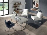 Вращающееся офисное кресло с подлокотниками. Обивка из кожзаменителя темно-синего цвета. Система вращения на 360º. Конструкция ножек из хромированной нержавеющей стали с колесами. Экокожа - Similar Acua 69.