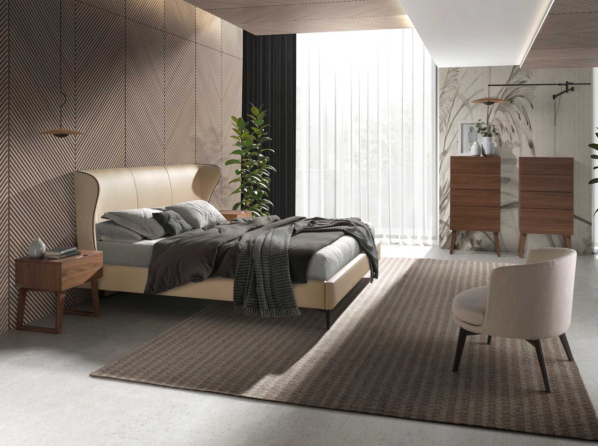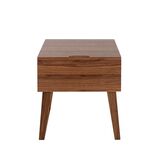 Прикроватная тумбочка CP 1702 -H — обязательный предмет интерьера для уюта в спальне от фабрики Angel Cerda. Тумбочка привлекает внимание своим нетипичным дизайном. Высокие ноги уж точно не ожидаешь увидеть в таком предмете интерьера. Поэтому для современного и стильного оформления спальной комнаты такой набор тумбочек безусловно подойдет лучшим образом. А универсальный древесный цвет позволит не менять ранее созданный интерьер. Тумбочка имеет традиционную прямоугольную форму. Передний фасад — это выдвижной ящик, у которого отсутствует ручка. Вместо нее дизайнеры сделали углубление вверху изделия. Ящик с доводчиком. Материал изготовления тумбочки — МДФ покрытый шпоном орехового дерева. Этот материал прочный и долговечный, эстетически привлекательный и современный. Ноги имеют рамочную конструкцию и образуют с основанием тумбочки тупой угол. Такое конструкционное решение смотрится оригинально и гарантирует изделию хорошую устойчивость, так как увеличивает площадь опоры. Тумбочка имеет следующие размеры: ширина — 45 см, высота — 40 см, глубина — 50 см. К комплекту прикроватных тумбочек можно приобрести из этой же коллекции буфет, женский столик, комод. Все изделия выдержаны в едином стиле, что, безусловно, создаст более полный интерьер.