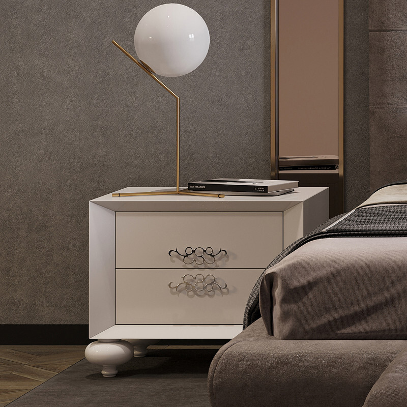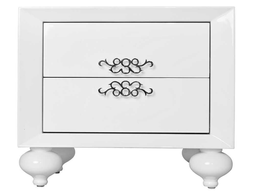 Прикроватная тумбочка выполнена в стиле Ар-деко. Красивая элитная мебель от лучших производителей сделает интерьер спальни по-настоящему роскошным. Прикроватная тумбочка станет украшением спальни. Оснащена двумя выдвижными ящиками. Система плавного закрывания делает ящички более удобными в обращении. Опирается на небольшие ножки красивой необычной формы. Ручки из хромированного металла. Сделана из высококачественного МДФ высокой плотности и массива дерева. Ручки изготовлены из хромированного металла. Ножки из массива гевеи и полимерной смолы
