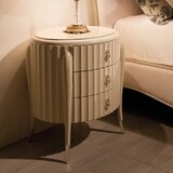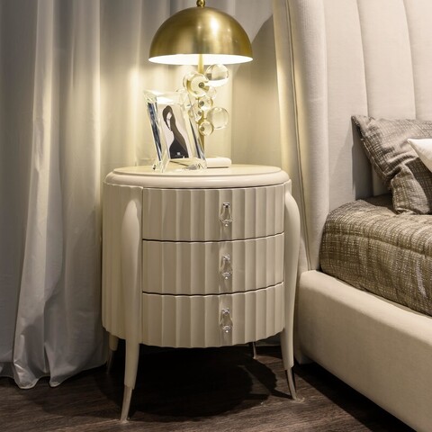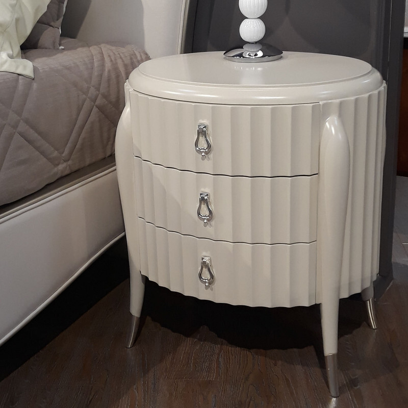 Элегантная прикроватная тумбочка от итальянского бренда Fratelli Barri овальной формы имеет три вместительных ящика и стоит на объемных изогнутых ножках. Тумбочка в неоклассическом стиле. Рифленые фасады. Отделка - бежевый матовый лак. Выполнена из массива дерева и высококачественного МДФ класса Е1. Цвет фурнитуры - хром. Дно ящиков декорировано черной бархатной тканью. Ящики оснащены доводчиками для плавного закрывания. Корпус ящиков - белого цвета.
