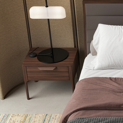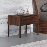 Прикроватная тумбочка, изготовлена из высококачественного, шпонированного МДФ высокой плотности. Тумбочка оснащена выдвижным ящиком. Ящик снабжен направляющими системы soft-close. Уникальная система последнего поколения добавляет невероятную плавность открывания/закрывания.