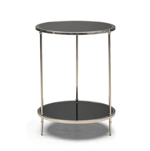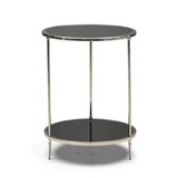 Приставной столик выполнен в стиле Ар-деко. Столешницы изготовлены из черного стекла. Ножки выполнены из полированной стали.