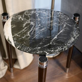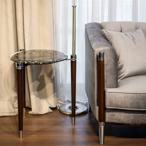 Приставной столик выполнен в стиле Ар-деко. Столешница из мрамора, ножки массив бука, детали из металла и мрамора