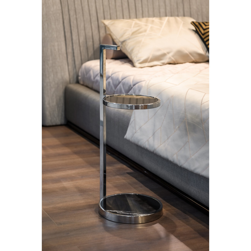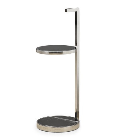 Приставной столик выполнен в стиле Ар-деко. Металлическое основание дополнено двойной столешницей из черного стекла и мрамора.