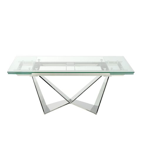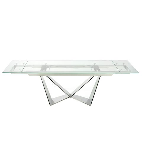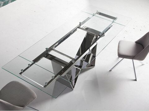 Стол CT2302 от фабрики Angel Cerda — ультрамодный дизайн и оригинальная конструкторская задумка. Стол удивляет и очаровывает с первого взгляда. В этой модели дизайнеры не скрывают конструкцию, а демонстрируют ее каждому, кто просто посмотрит на стол сверху. Но выставленная напоказ «начинка» вовсе не отталкивает, а наоборот, заставляет рассмотреть каждую деталь подробнее, чтобы разгадать устройство этого «технологичного» изделия. Стол сделан из хромированной стали и наделен раздвижной стеклянной столешницей. Благодаря реечному механизму удлинения, увеличить габариты стола просто и быстро — достаточно выдвинуть с обеих сторон дополнительные секции (они также видны под стеклом столешницы). Закаленное стекло имеет высокий предел прочности. Плюс к этому, его поддерживает каркас из металла. Поэтому, эту модель можно в полной мере использовать в качестве обеденного стола. Металлические ножки имеют необычную конструкцию. Оригинальная геометрия в сочетании с хромированной сталью образует удивительную игру отражений, еще более привлекая внимание к данной модели. Стол будет уместен в гостиной, выполненной в стиле модерн (с преобладанием мебели из стекла и металла), хай-тек, фьюжн. Размеры — 160×90×75 (длина, ширина, высота). Вес стола составляет 104 кг. Доставка осуществляется в разобранном виде. Для правильной сборки в комплект входит необходимый крепеж и инструкция.