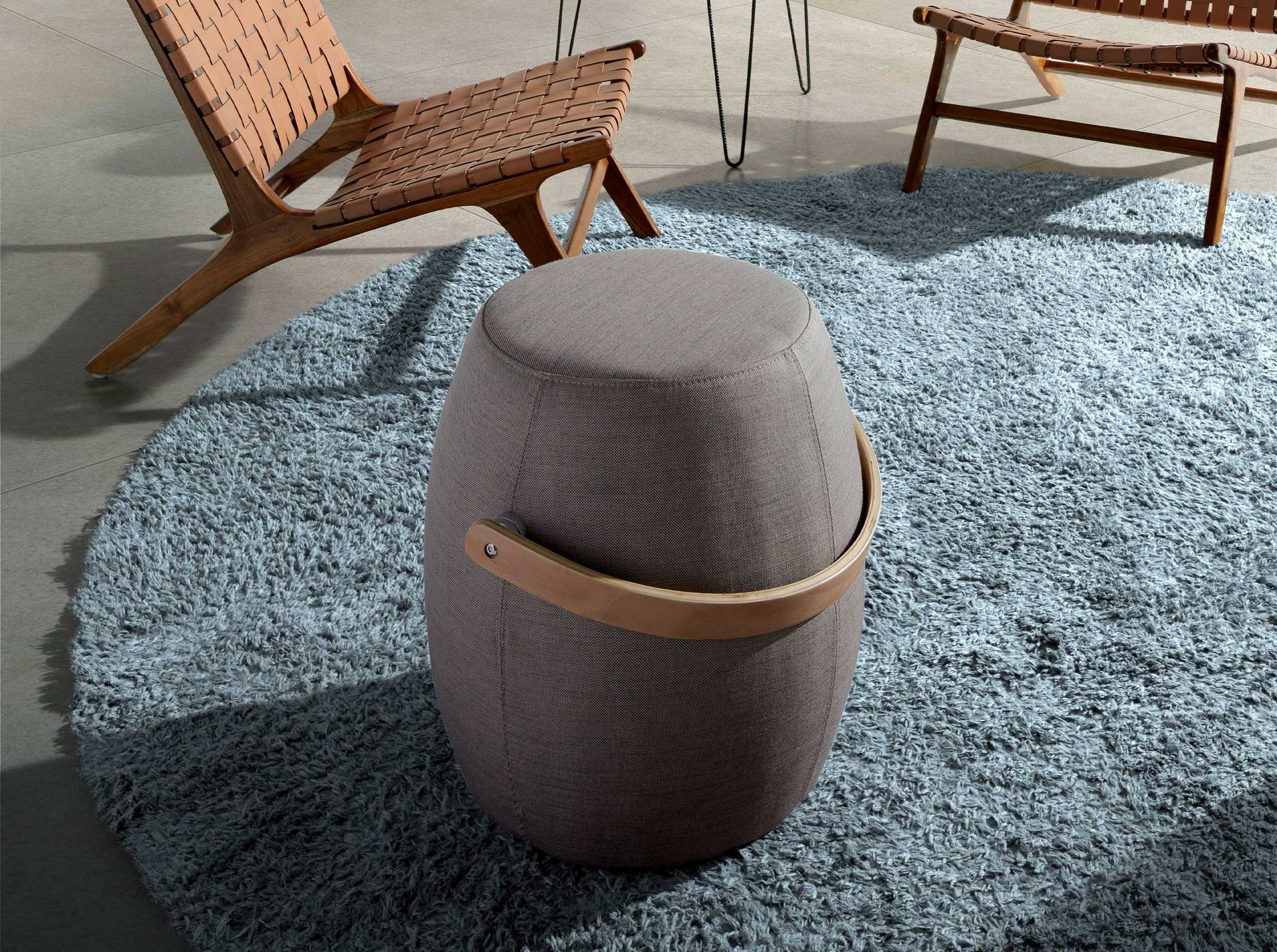 Пуф CLUB54 от фабрики Angel Cerda – оригинальный дизайн и скрытое место для хранения. Пуф CLUB54 станет вдвойне полезным предметом мебели в вашей квартире. Легко справляясь с ролью табурета или подставки под ноги, он решит задачу хранения пледа или других вещей. Скрытый внутренний отсек – практичная деталь, дающая этому пуфу явное преимущество перед аналогами. А универсальный цвет обивки и минималистичный дизайн – гарантия совместимости с современным городским интерьером. Пуф имеет цилиндрическую форму, сделан из прочной фанеры. Внешняя поверхность обита текстилем серого цвета с мягким наполнителем. Сиденье представляет собой крышку, убрав которую, открывается отсек для хранения вещей. Сбоку крышки есть ручка в виде петли из кожи коричневого цвета. Материал обивки – 100% полиэстер. Он прочный, износостойкий, поддается чистке от загрязнений. Размеры пуфа: высота – 40 см, ширина – 44 см, глубина – 44 см. Вес изделия – 10 кг. Изделие не рекомендуется ставить под прямые солнечные лучи. Использование отбеливателей и абразивов для чистки может испортить внешний вид. Ткань - CLUB54.