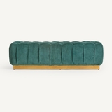 Стильный завершающий штрих. Прикроватная скамейка Lignitz в стиле ар-деко сочетает в себе зелёный бархат, золотистый металлический каркас и манговое дерево. Наполнитель — пенополиуретан. Ширина: 150 см, Глубина: 60 см, Высота: 42 см