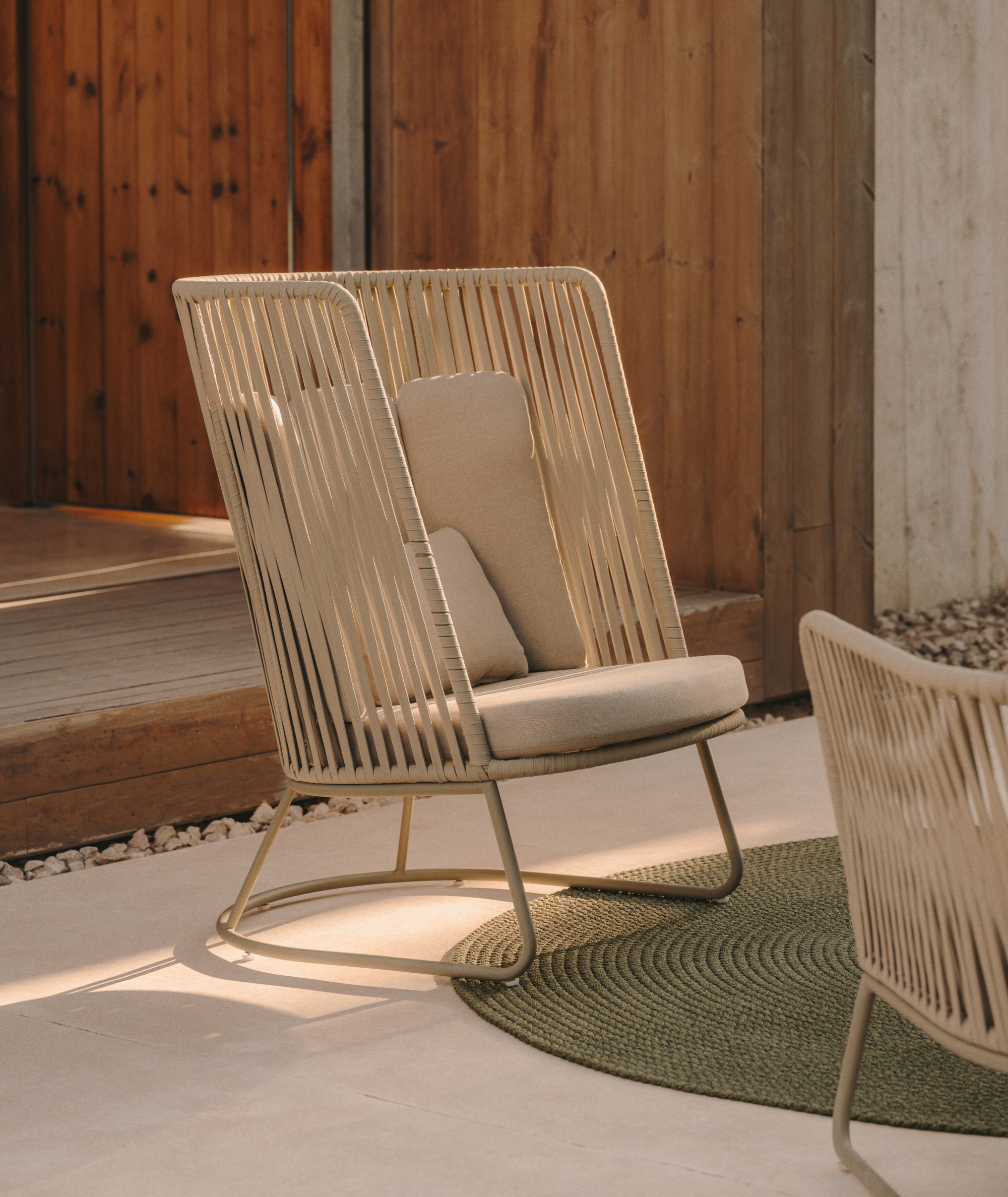 Saconca - идеальная коллекция для любого экстерьера. Создайте идеальный контраст на своей террасе или в саду с помощью этого кресла, сочетающего в себе натуральность шнура и современность стали.