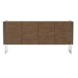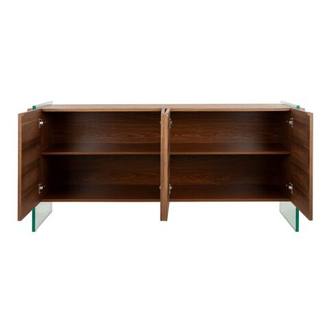 Сервант MI1319A-NOGAL — безупречная простота и практичность от фабрики Angel Cerda. Этот сервант создан для тех, кому нужны высокие полки и много места внутри. Здесь нет узких ящиков, но зато имеются большие секции, куда с легкостью поместятся не только книги, но и крупногабаритная посуда или бытовая техника. Дизайн оригинален тем, что тут ножками служат две панели из стекла. Это не делает изделие громоздким и дает акцент на удивительно красивую фактуру орехового дерева. Конструкционно сервант представляет собой прямоугольный каркас, разделенный вертикальной перегородкой на две половины. Каждый отсек закрывается на двухстворчатую дверь, оснащенную доводчиками. Внутри с каждой стороны предусмотрено по одной полке, которые находятся на одной высоте от основания каркаса. Материал изготовления — МДФ и шпон орехового дерева. Эта порода отличается прочностью, красивым и широко востребованным в современном интерьере природным рисунком. По бокам прикручены две панели из прозрачного ударопрочного стекла. Они проходят через всю высоту изделия и с внешней стороны закрываются деревянным накладками. Такой дизайнерский ход выглядит не только оригинально (словно стекла насквозь пронзают мебель), но и обеспечивает более надежную конструкцию. Размеры серванта: ширина — 170 см, высота — 77 см, глубина — 43 см. Необходима самостоятельная сборка (дверцы приходят отдельно). Инструкция и крепеж входят в комплектацию.