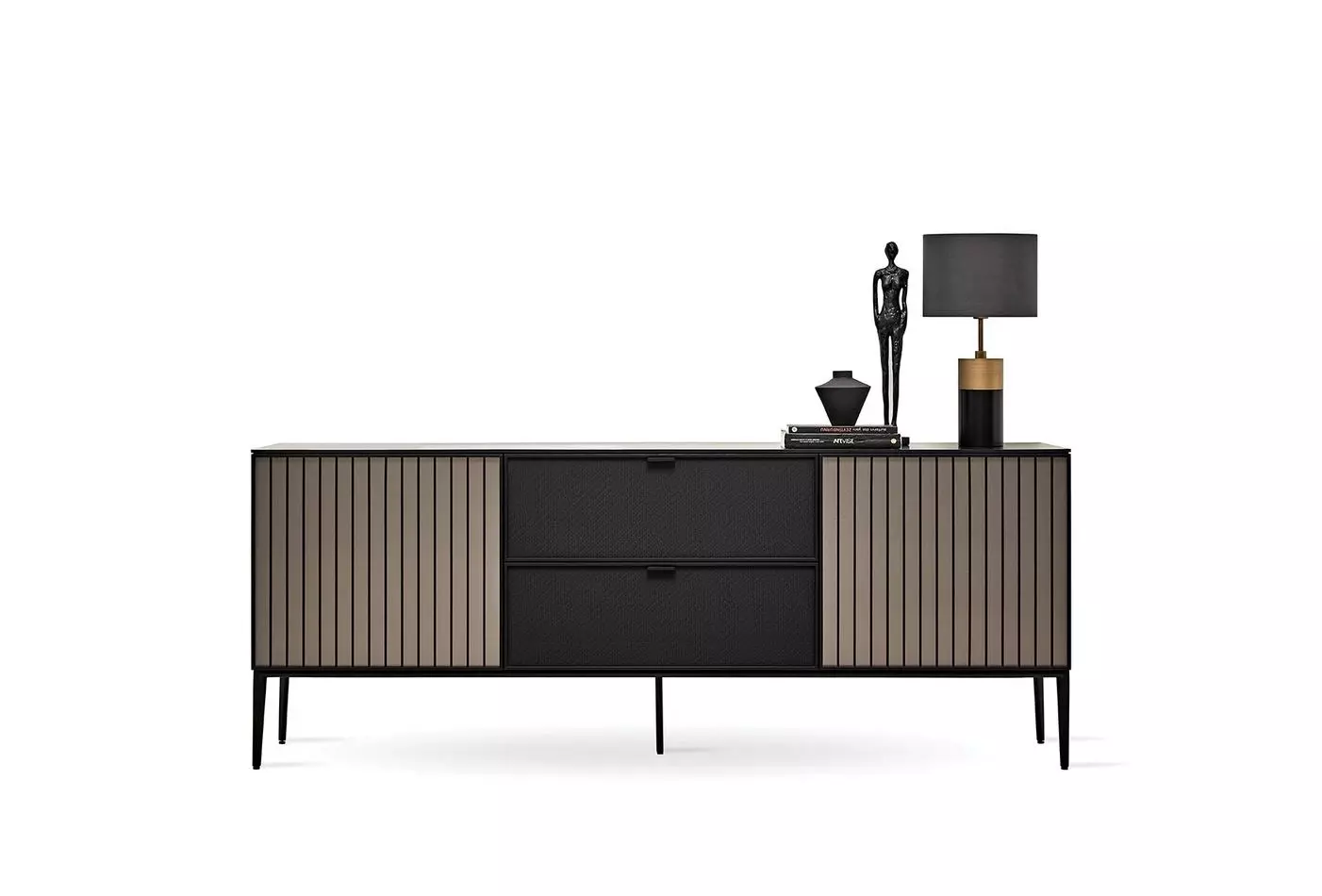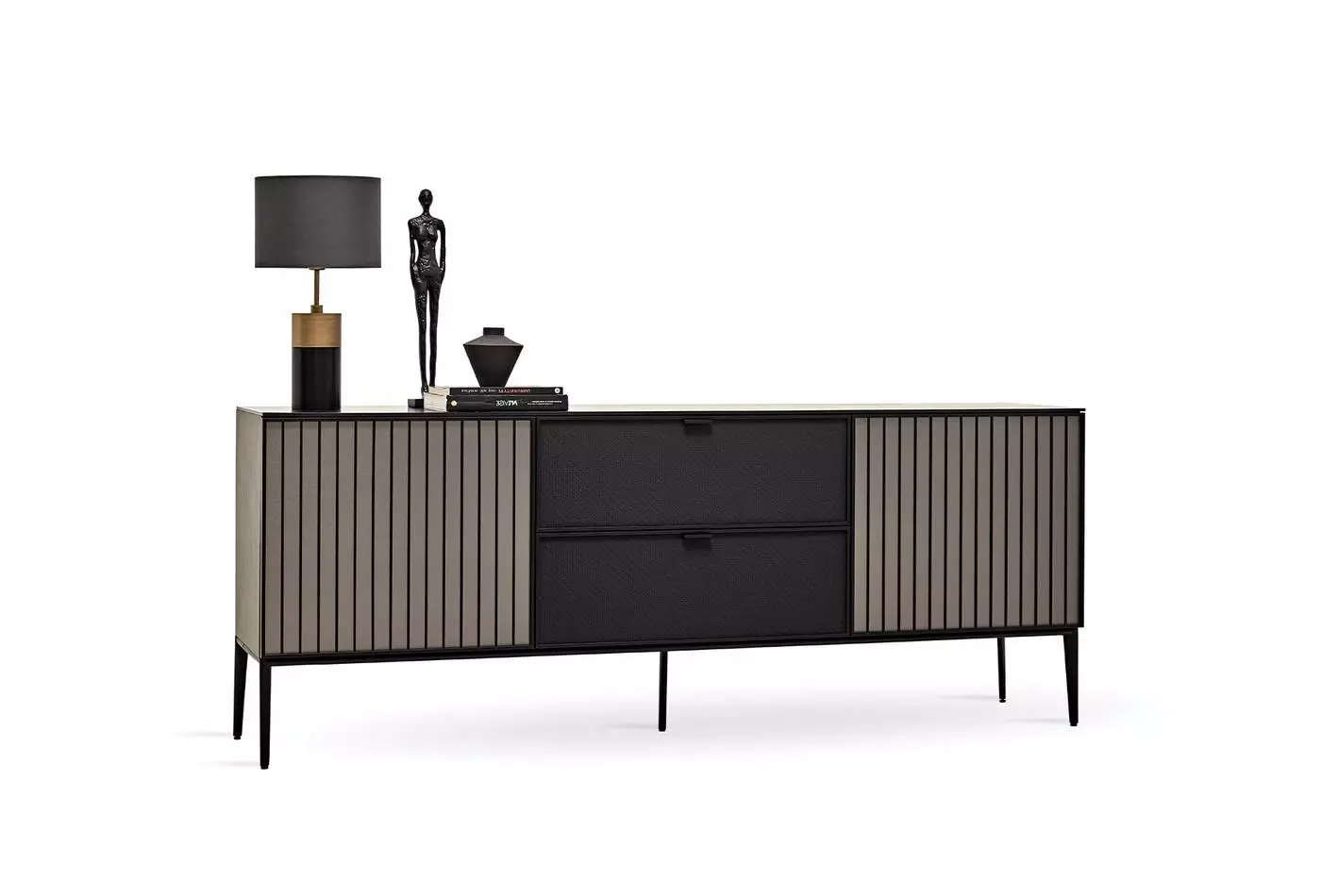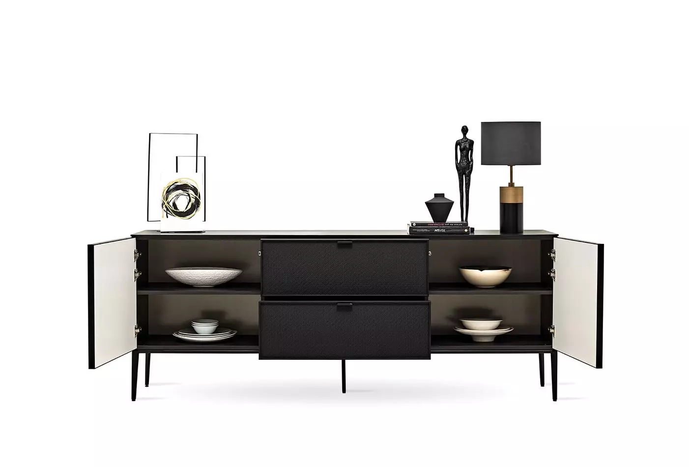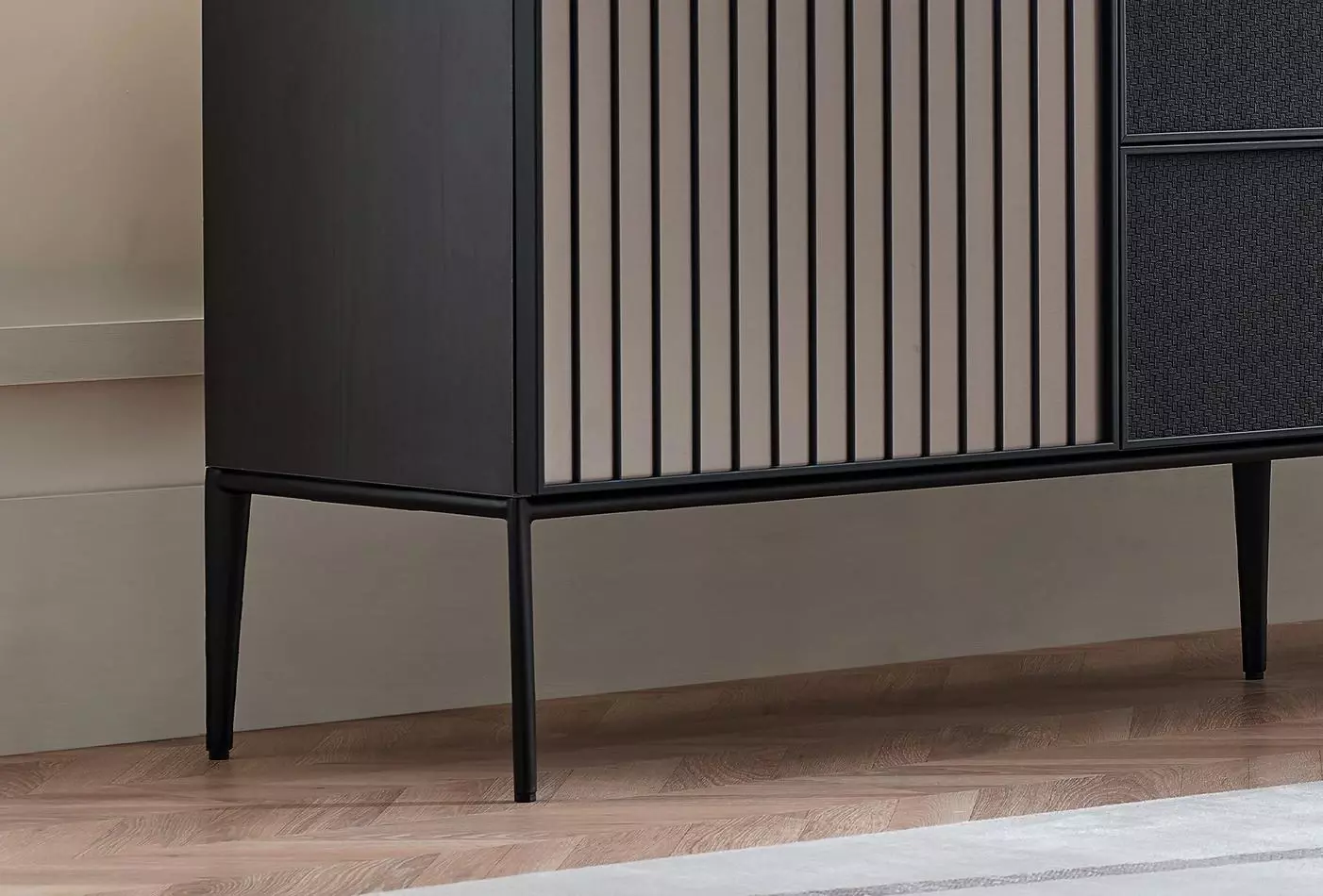 Благодаря сочетанию черной профильной рамы, эффекта металла на корпусе, черных матовых металлических ручек, и кожаным вставкам на поверхности фасада сервант подчеркивает элегантность и утонченность интерьера.