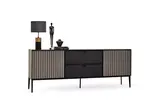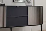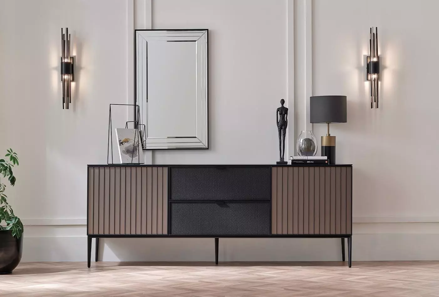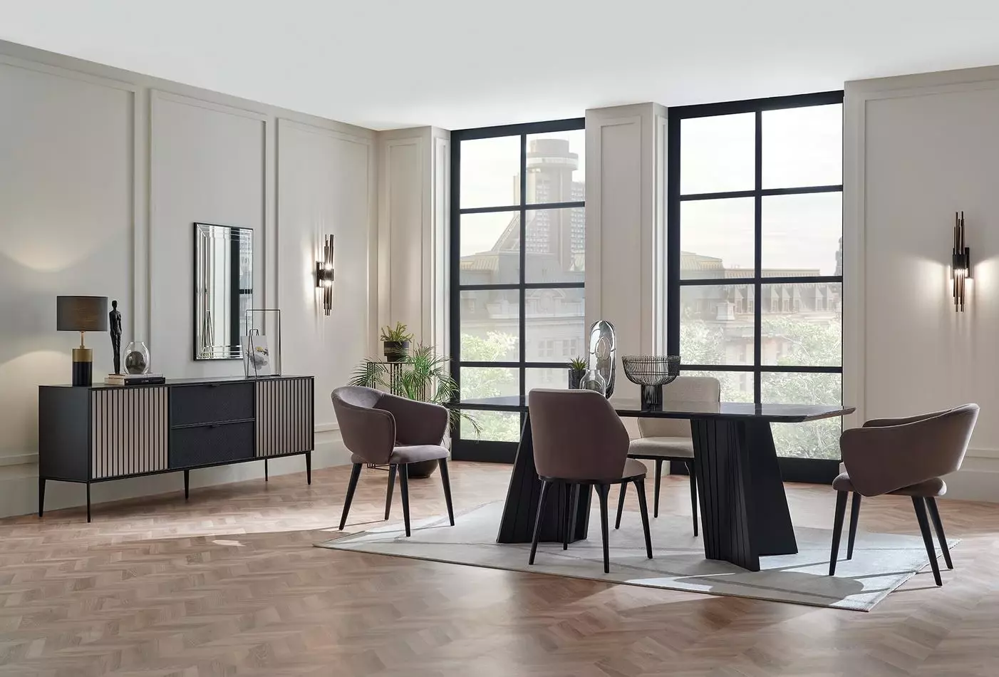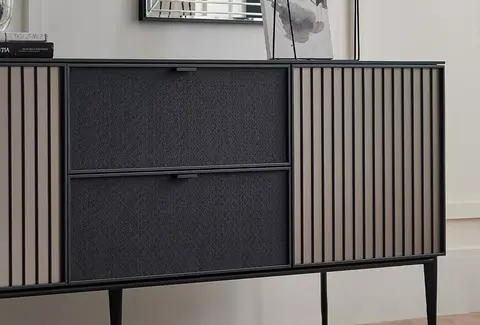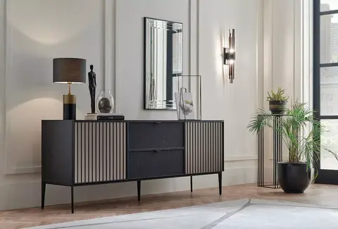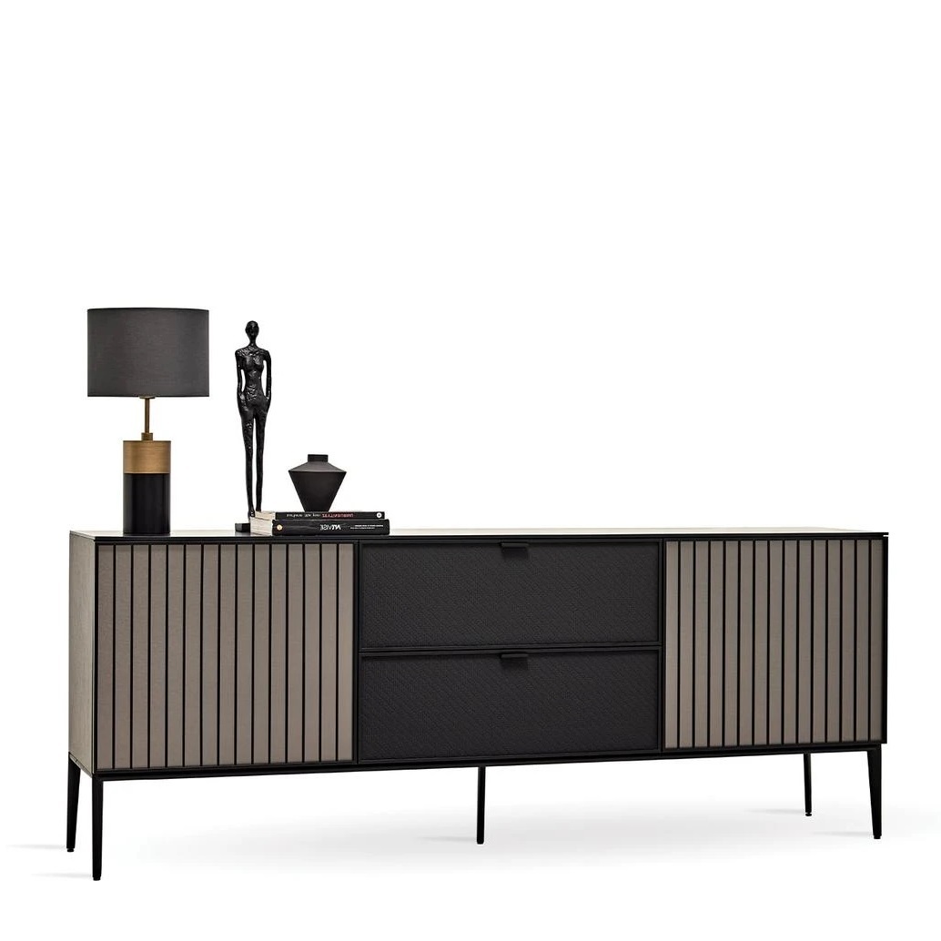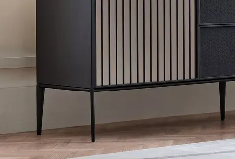 Благодаря сочетанию черной профильной рамы, эффекта металла на корпусе, черных матовых металлических ручек, и кожаным вставкам на поверхности фасада сервант подчеркивает элегантность и утонченность интерьера.