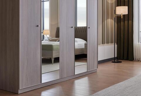 Гардероб выполнен в современном стиле. Благодаря использованию текстуры светлого дуба, профиля светло-серого цвета и зеркал на дверцах гардероб подчеркнет простоту и элегантность вашей спальни. На дверях гардероба используется зеркало натурального цвета.