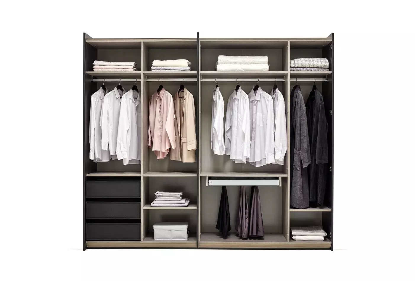 Внутри шкафа установлено 3 выдвижных ящика, которые украшены черной профильной рамой и черной кожей. Также в шкафу есть выдвижная вешалка для брюк, штанги для одежды и большое количество полок для хранения.
