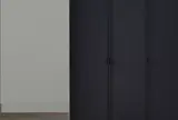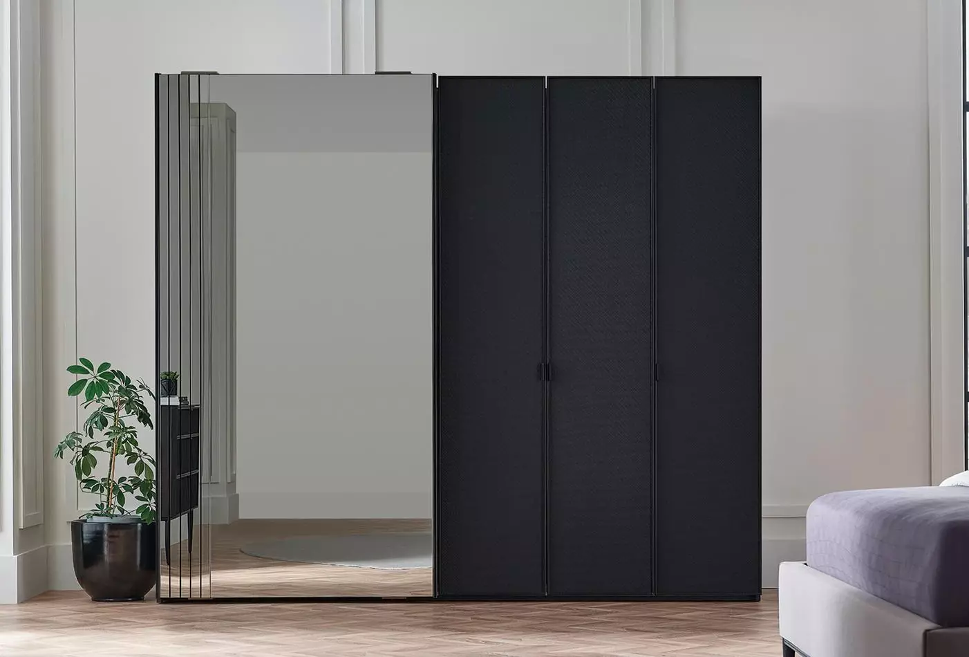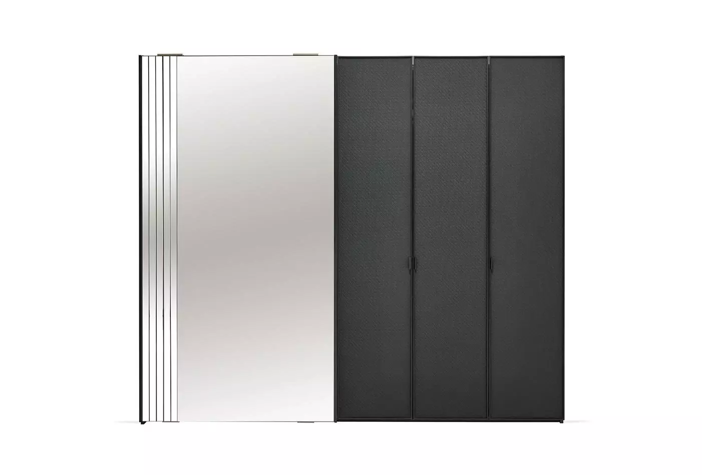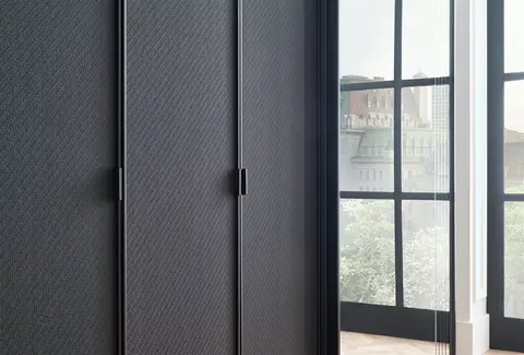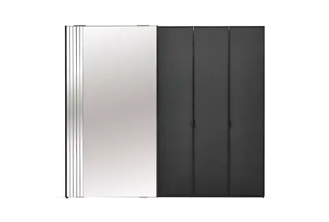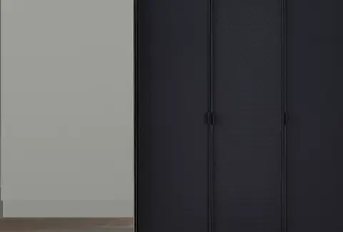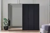 Благодаря сочетанию черной профильной рамы, эффекта металла на корпусе, и кожаным вставкам на поверхности фасада гардероб подчеркивает элегантность и утонченность интерьера.