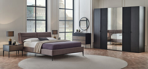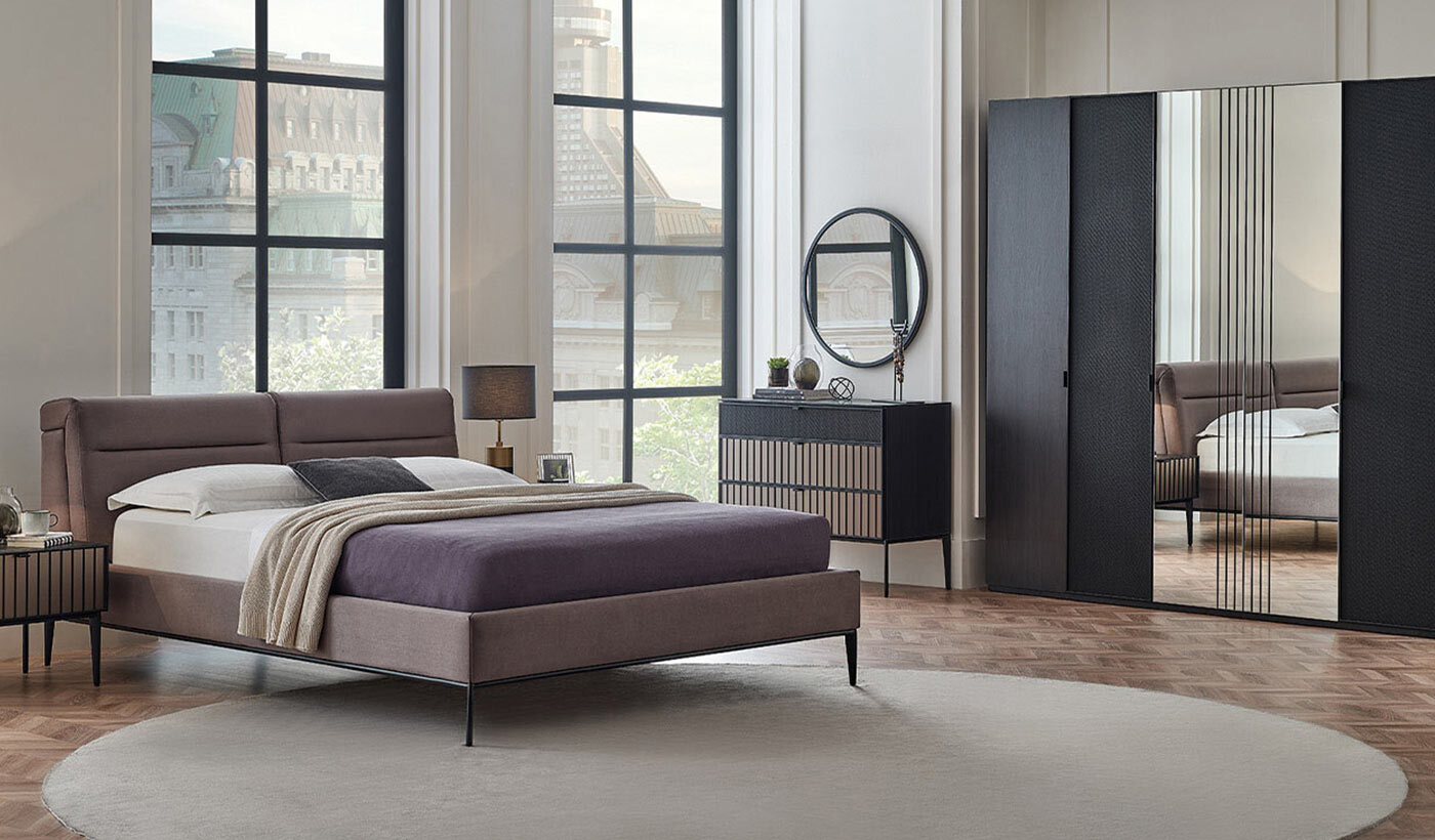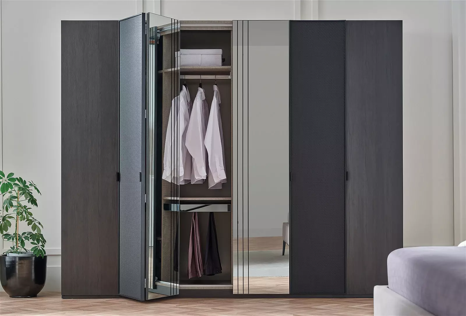 Благодаря сочетанию черной профильной рамы, эффекта металла на корпусе, и кожаным вставкам на поверхности фасада гардероб подчеркивает элегантность и утонченность интерьера.