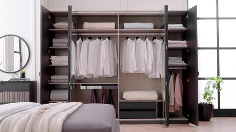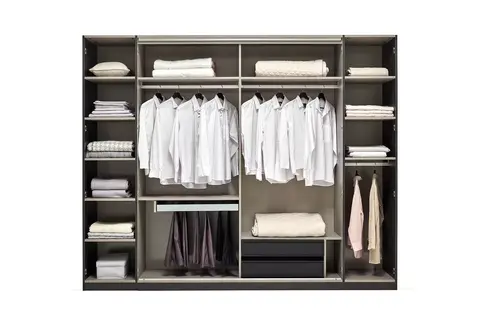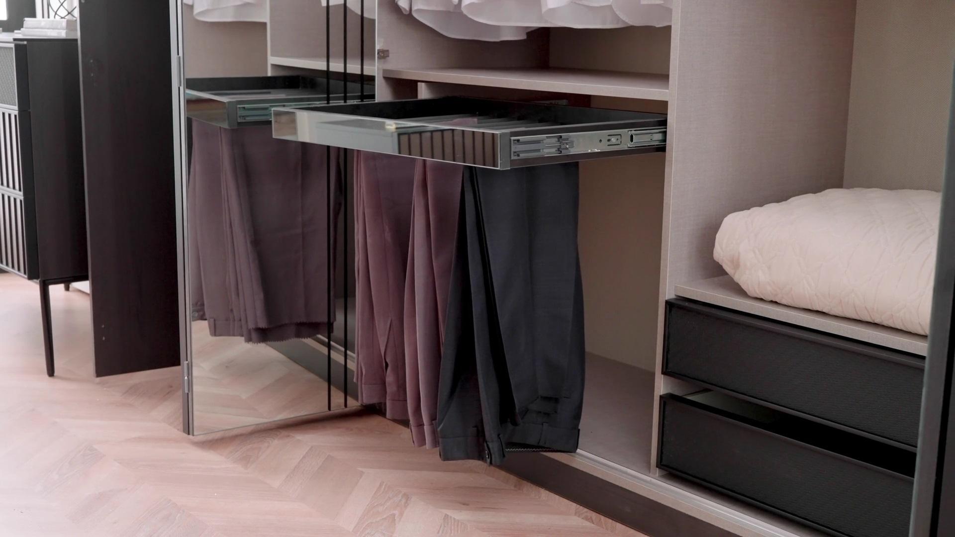 Внутри шкафа установлено 2 выдвижных ящика, которые украшены черной профильной рамой и черной кожей. Также в шкафу есть выдвижная вешалка для брюк, штанги для одежды и большое количество полок для хранения.