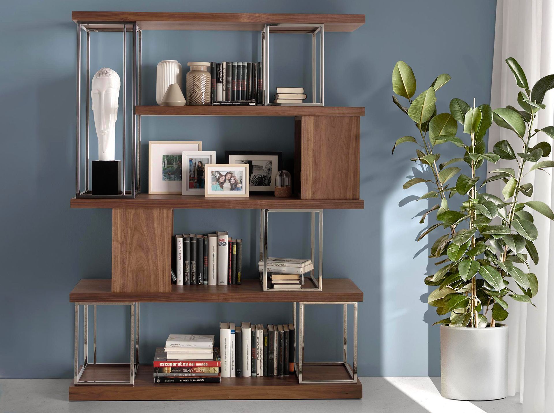 Стеллаж MQ2101SF от фабрики Angel Cerda – интересная геометрия и идеальная древесина. Стеллаж MQ2101SF – это идеальный баланс хромированной стали и древесины. Сложная геометрическая конструкция показательно демонстрирует эту гармонию, убеждает в своей надежности и эстетичности. Стеллаж прекрасно впишется в интерьер городской квартиры, сможет принять много вариантов расстановки аксессуаров. Стеллаж имеет сборную конструкцию в четыре яруса. Она состоит из деревянных панелей (МДФ со шпоном грецкого ореха) и металлических опор с хромированным покрытием. Все деревянные элементы покрыты защитным прозрачным лаком. Нижняя полка стеллажа является основанием. Поэтому максимальная нагрузка должна быть на ней. Остальные полки не рекомендуется нагружать весом более 5 кг. Размеры стеллажа: ширина – 129 см, высота – 170 см, глубина – 35 см. Вес изделия – 45 кг. Потребуется сборка.