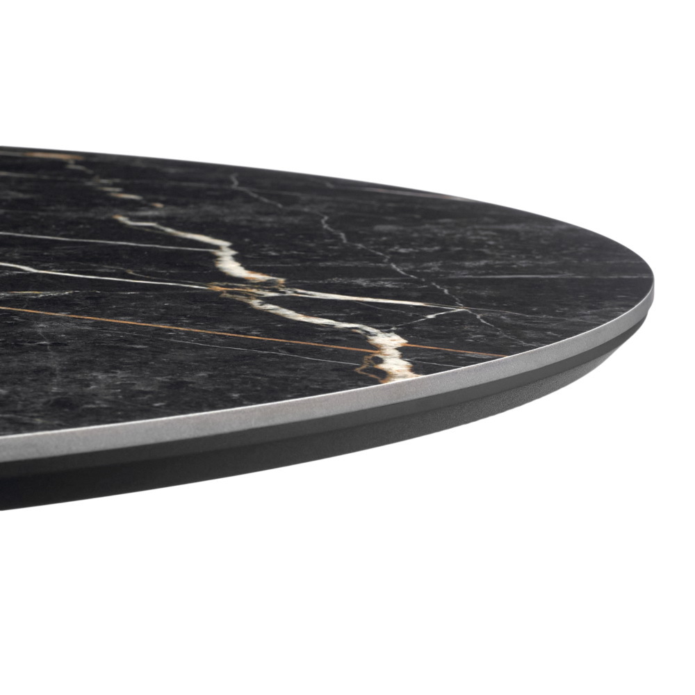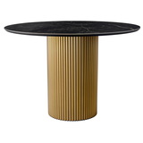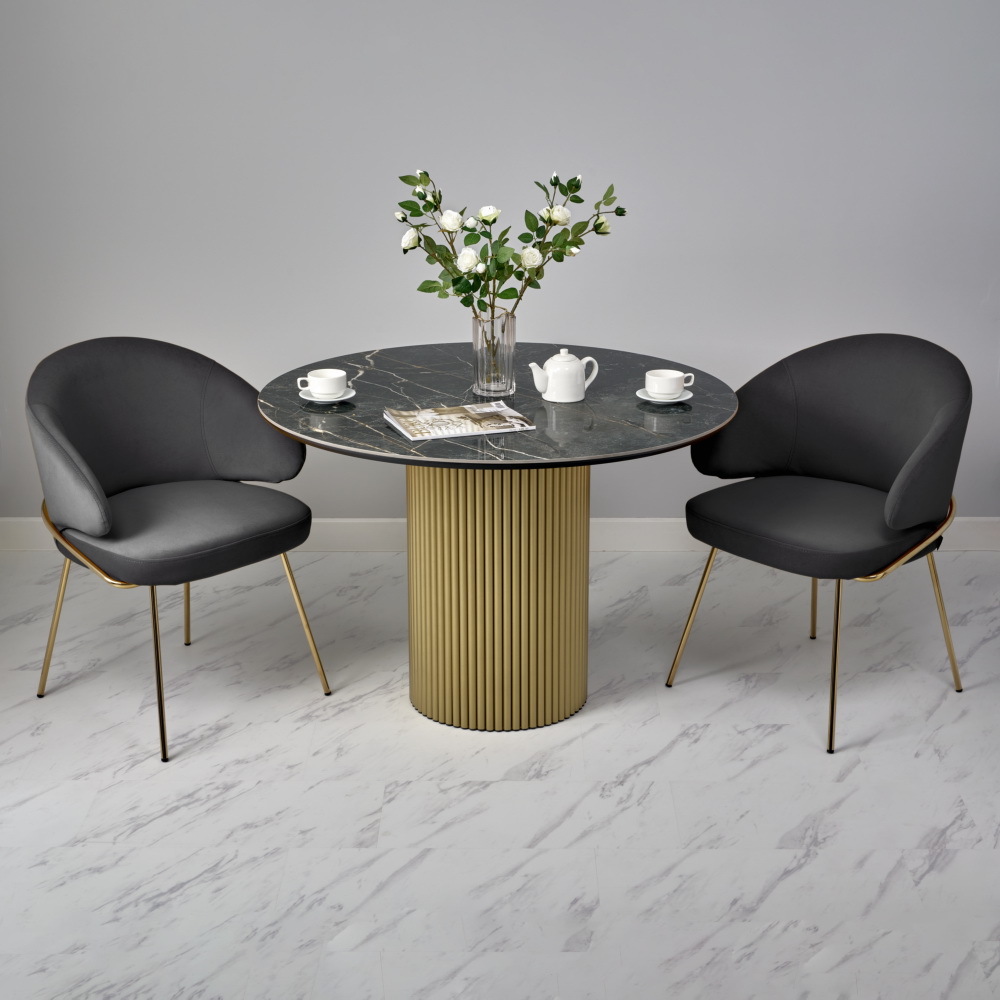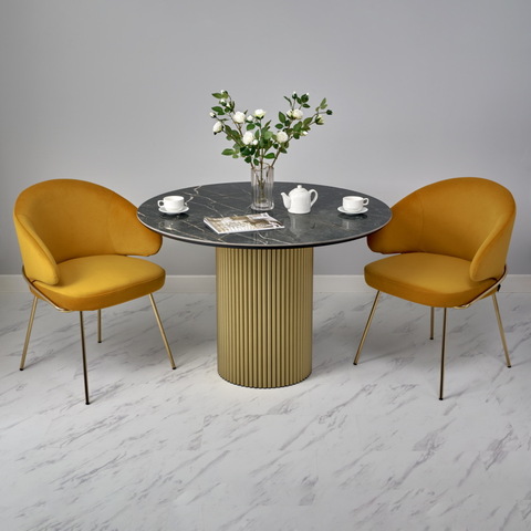 Стильный нераздвижной стол Aura – идеальное сочетание элегантности и функциональности. Стол Aura обладает глянцевой премиальной круглой столешницей из керамики, имитирующей чнрный мрамор, диаметром 110 см. Высококачественная керамическая столешница: поверхность стола не царапается, не впитывает жидкость и легко моется, что обеспечивает долгий срок службы и минимальный уход. Устойчивость к перепадам температур: идеально подходит для использования в любых условиях, не теряя своего великолепного вида. Роскошный дизайн: кристально-черный фон столешницы с элегантными серыми прожилками и изысканными золотистыми деталями добавляет нотку роскоши и утонченности интерьеру. Элегантная круглая опора: металлическая основа золотого цвета придает столу стабильность и стильный современный вид, идеально гармонируя с мраморной столешницей. Стол Aura – это воплощение утонченного стиля и непревзойденного качества, которое украсит любой интерьер и станет любимым местом для встреч и общения. Подчеркните уникальность вашего дома с помощью стола Aura.
