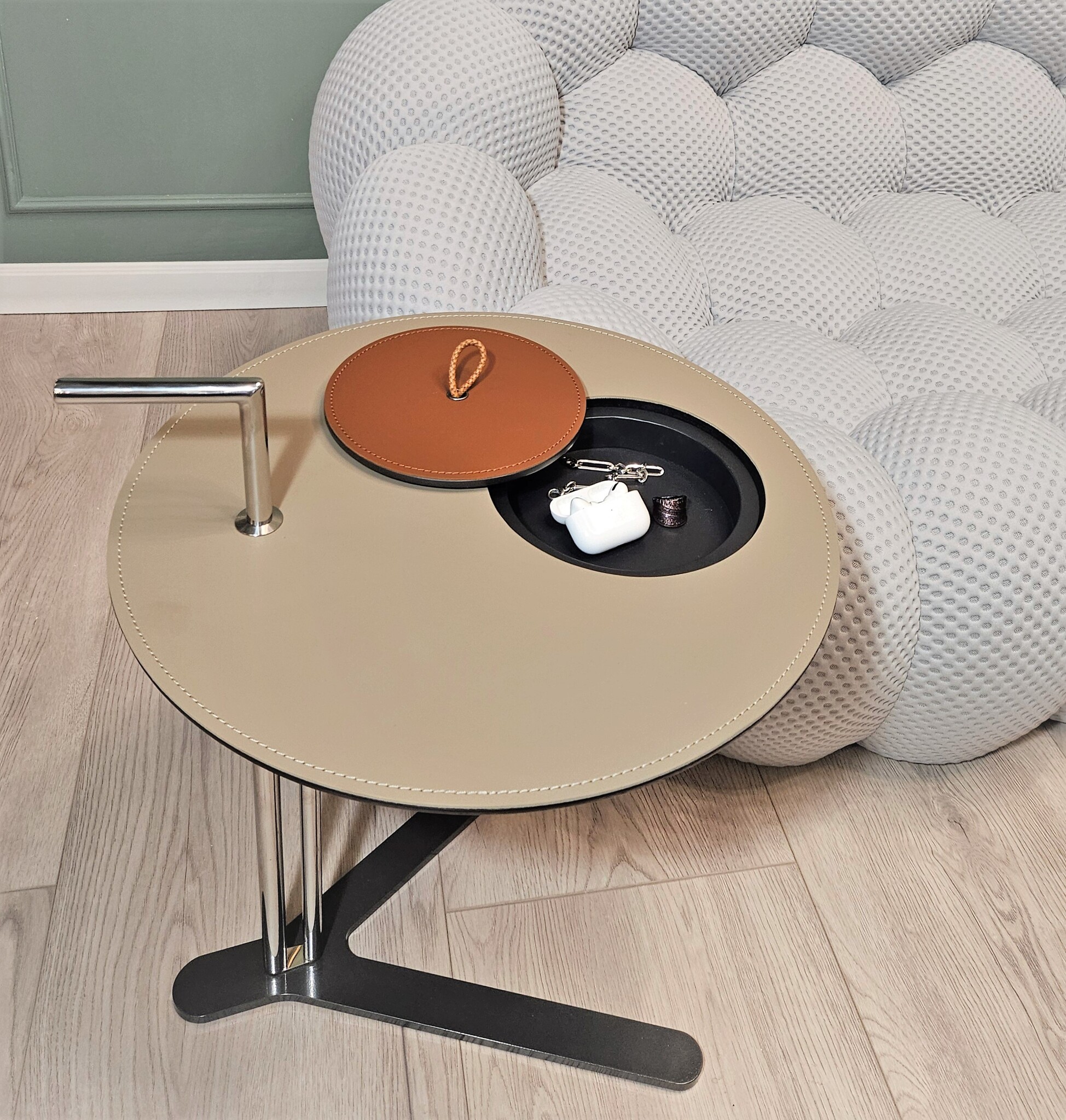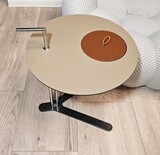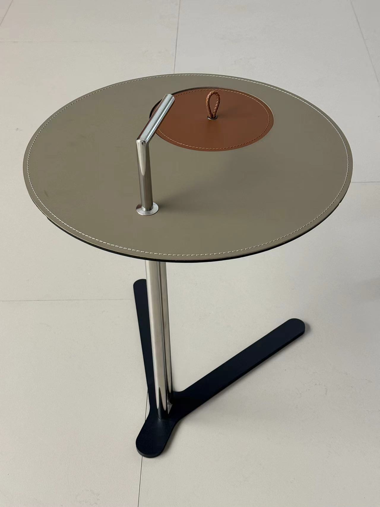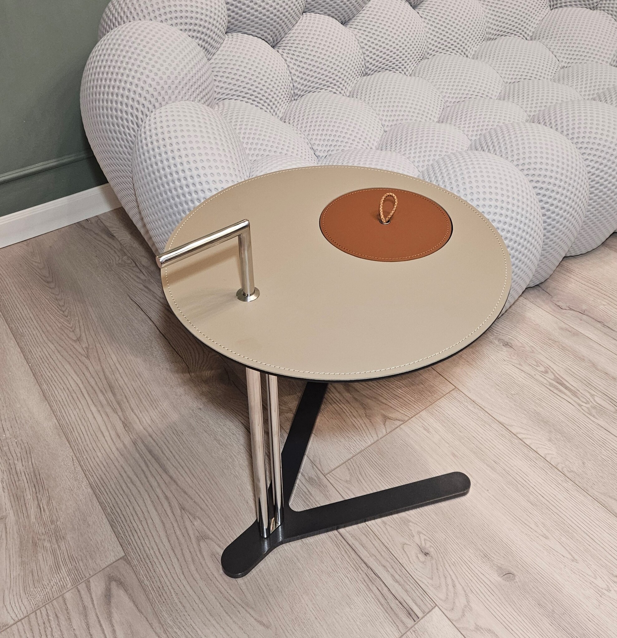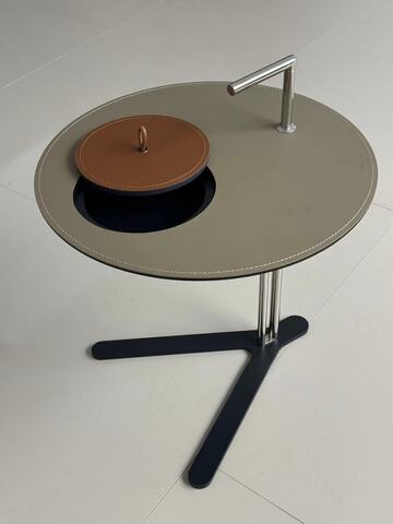 Столик с круглой столешницей из экокожи с видимой строчкой и тонкой трубчатой конструкцией из стали. Легкий по весу, его удобно переносить и он идеально впишется в любой интерьер.