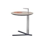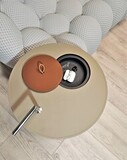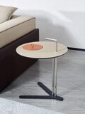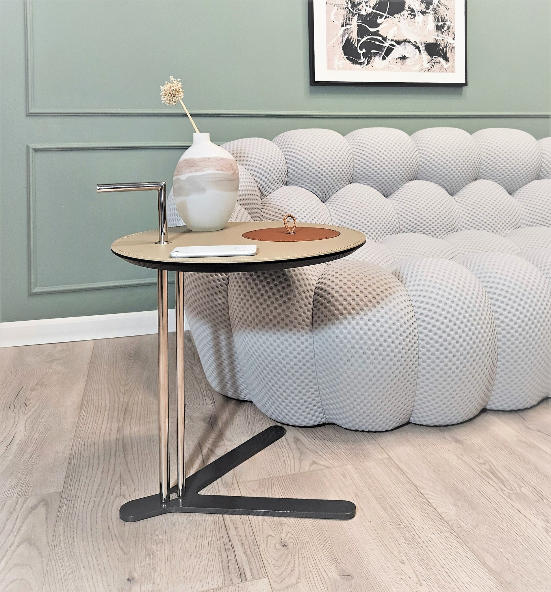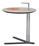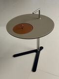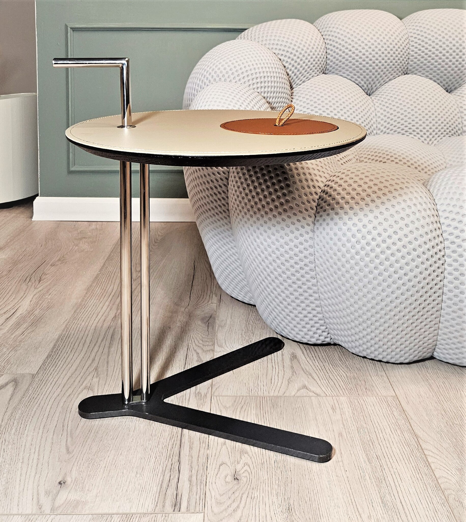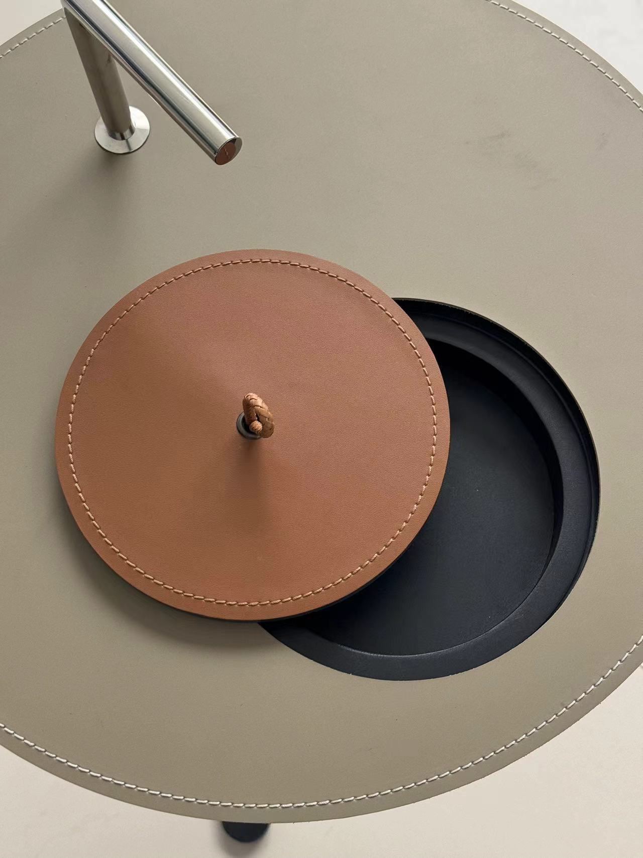 Столик с круглой столешницей из экокожи с видимой строчкой и тонкой трубчатой конструкцией из стали. Легкий по весу, его удобно переносить и он идеально впишется в любой интерьер.