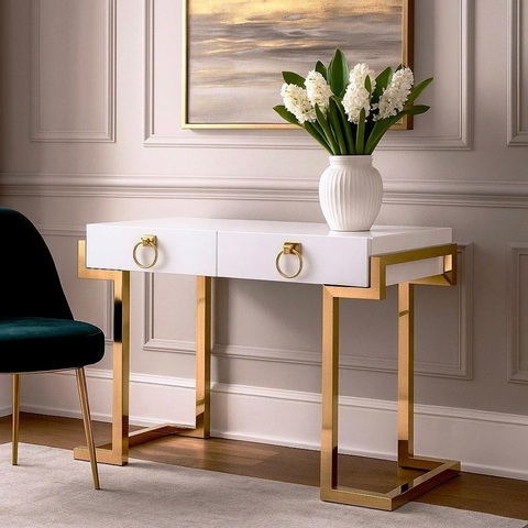 Стол-консоль Атлас МС9002-120W — это стильное и функциональное решение для современного интерьера. Эта дизайнерская консоль идеально подойдет как для прихожей, так и для гостиной или спальни, добавляя пространству света, легкости и изысканности. Модель выполнена в универсальном белом глянцевом цвете, который визуально расширяет пространство и делает ее центральным элементом даже в небольшом коридоре. Столешница изготовлена из высококачественного МДФ с глянцевым покрытием, устойчивым к царапинам, влаге и загрязнениям. Такая поверхность легко очищается и сохраняет свой блеск на протяжении многих лет. Особенностью модели являются выдвижные ящики, обеспечивающие удобное хранение ключей, перчаток, украшений, косметики или канцелярии. Это делает консоль особенно полезной в качестве туалетного столика, рабочей поверхности или элемента хранения в прихожей. Каркас выполнен из нержавеющей стали с глянцевым золотым покрытием, что придает изделию ощущение роскоши и контрастирует с белой столешницей. Такой дизайн органично вписывается в стили: ар-деко, гламур, минимализм, современная классика. Размеры 120×60×78 см обеспечивают достаточную вместительность и комфорт при использовании. Консоль легко собирается и устойчива в эксплуатации. Подходит как для домашнего использования, так и для интерьеров в офисах, отелях и апартаментах. Этот стол-консоль станет стильным и практичным акцентом в вашем интерьере. Материал: МДФ, нержавеющая сталь Цвет: белый глянцевый, глянцевое золото Размер: 120x60x78 см 1шт/2корбки Размер упаковки: 118x65x20; 81x29x64 см Вес нетто: 36,40кг Вес брутто: 40,60кг Гарантия 1 год