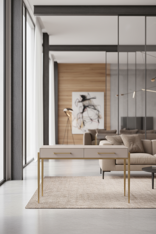 Стол-консоль Роззи MC9003-120BG — это стильное и функциональное решение для современного интерьера. Эта дизайнерская консоль станет универсальным элементом в прихожей, гостиной или спальне, сочетая в себе элегантность, комфорт и практичность. Столешница изготовлена из МДФ, обитого экокожей бежевого цвета, что придает поверхности мягкости, благородного вида и тактильного комфорта. Материал устойчив к истиранию, легко очищается от загрязнений и не требует сложного ухода. Такая отделка добавляет интерьеру уюта и современной роскоши. Каркас выполнен из нержавеющей стали с покрытием под матовое золото, что обеспечивает прочность, долговечность и изысканный внешний вид. Матовое золото смотрится более сдержанно и стильно, чем глянцевое, идеально подходя для интерьеров в стилях ар-деко, современная классика и минимализм. Особенность модели — два вместительных выдвижных ящика, которые позволяют удобно организовать хранение: ключей, украшений, косметики, документов или аксессуаров. Это делает консоль особенно полезной в качестве туалетного столика или функционального элемента в прихожей. Размеры 120×55×78 см делают консоль удобной как для узких, так и для просторных помещений. Глубина 55 см обеспечивает достаточную рабочую поверхность, при этом не мешает проходу. Модель органично вписывается в светлые интерьеры, особенно в сочетании с зеркалами в металлических рамках, текстилем бежевых тонов и мягким освещением. Консоль поставляется в разобранном виде. В комплекте — подробная инструкция по сборке и вся необходимая фурнитура. Этот стол-консоль — идеальный выбор для тех, кто ценит сочетание стиля, функциональности и утонченного дизайна. Материал столешницы: МДФ обито экокожей, цвет бежевый, ножки из нержавеющей стали, цвет матовое золото Вес нетто: 33,20 кг Вес брутто: 34,20 кг 1шт/2коробки Размер упаковки: 120x61x20; 75x54x17 см Гарантия 1 год