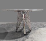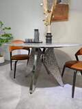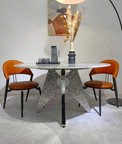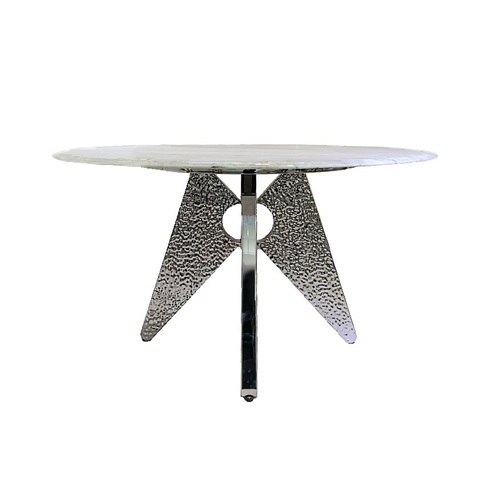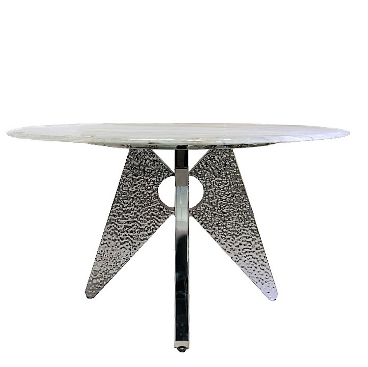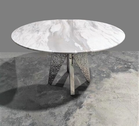 Основание выполнено из металла. Цвет никель. Гальваническое покрытие. Керамогранит глянцевый белый с рисунком Calacatta. Стол комфортно позволит разместить 6 персон.