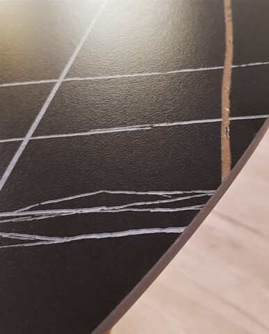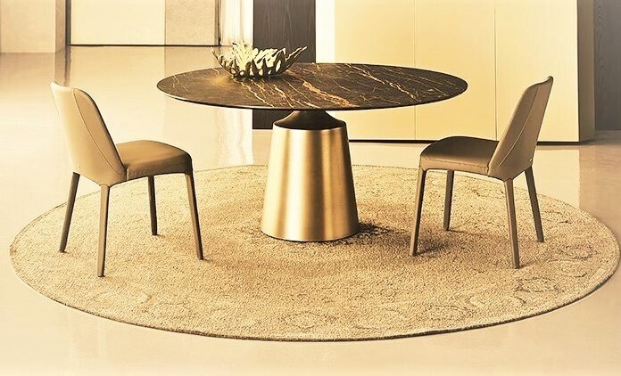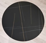 Стол представлен в двух вариантах: - черный керамогранит, поверхность матовая; - белый керамогранит, поверхность глянцевая. Основа из металла в цвете латунь браш. Стол комфортно позволит разместить 6 персон.