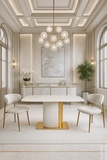 Дизайнерский прямоугольный обеденный стол с закругленными углами и столешницей из закаленного стекла, цвет светло-серый, с золотым основанием Стол обеденный Барнео BS1802-160GR — это стильное и практичное решение для современного интерьера. Прямоугольный обеденный стол с закругленными углами сочетает в себе утонченный дизайн и высокую функциональность. Верхняя часть изделия выполнена из прочного закаленного стекла, которое не только выглядит элегантно, но и обладает повышенной устойчивостью к царапинам, перепадам температур и механическим повреждениям. Каркас стола изготовлен из металла с покрытием под золотой оттенок, это придает изделию роскошный внешний вид и делает его ярким акцентом любого помещения. Цвет столешницы — светло-серый, что добавляет образу лаконичности и универсальности. Округлые края обеспечивают безопасность и удобство как в семейных обедах, так и в торжественной обстановке. Такой дизайнерский стол легко впишется в интерьер в стиле минимализм, лофт или гламур. Благодаря качественным материалам и продуманной конструкции, стол подходит для ежедневного использования и сохранит свой первоначальный внешний вид на долгие годы. Столешница - закаленное стекло с полимерным покрытием, цвет: светло-серый Основание: МДФ, нержавеющая сталь, глянцевое золото 160х90х76 см Вес нетто: 94,55 кг Вес брутто: 97,55 кг Страна производитель: Китай Гарантия 1 год