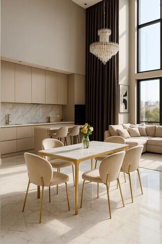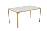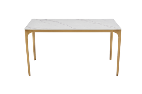 Стол обеденный Столешница: керамогранит (12мм), цвет: белый мрамор (Статуарио) Ножки из нержавеющей стали с золотым порошковым окрашиванием 140х80х75 см Страна производитель: Китай Вес нетто 42,25 кг Вес брутто 50,60 кг Объем 0,223 Упаковка 1/2 Размер: 155х95х11, 77х29х29 см Гарантия 1 год