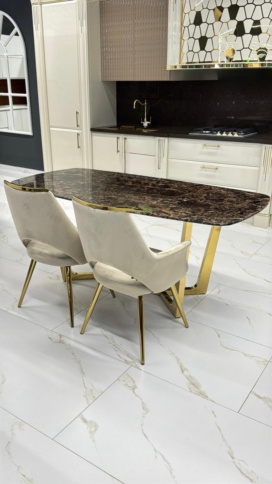 Стол обеденный Ланс DT-2852M.1 — это элегантное сочетание строгих форм и благородного дизайна. Этот обеденный дизайнерский стол станет центральным элементом вашей столовой или гостиной, подчеркивая хороший вкус и утонченность интерьера. Модель выполнена в классической прямоугольной форме с закругленными краями, что делает ее безопасной и удобной как для повседневных семейных приемов, так и для торжественных случаев. Размеры 160×90×75 см позволяют комфортно разместить до 6 человек, обеспечивая достаточное пространство для посуды и блюд. Особенностью изделия является столешница из искусственного мрамора коричневого цвета с глянцевой поверхностью — материал, который имитирует текстуру натурального камня, но при этом более легок в уходе и устойчив к внешним воздействиям. Он экологичен, гигиеничен, легко моется и не теряет своего блеска. Искусственный мрамор значительно легче натурального, что упрощает его перевозку и монтаж. Кроме того, его доступная стоимость делает этот материал еще более привлекательным. Глубокий оттенок и зеркальный блеск добавляют изделию роскошного вида и создают эффект теплоты и уюта в интерьере. Каркас изготовлен из нержавеющей стали с глянцевым золотым покрытием, обеспечивающим долговечность и устойчивость к коррозии. Такое основание выглядит строго и современно, гармонируя с насыщенным оттенком столешницы. Этот обеденный стол легко впишется в стиль минимализма, гламура или современной классики. Он одинаково уместен как в домашней обстановке, так и в ресторанах, кафе или офисных зонах отдыха. Размер: 160х90х75 см Столешница: искусственный мрамор с глянцевой поверхностью Цвет: коричневый мрамор Подстолье: нержавеющая сталь с глянцевым золотым покрытием Вес нетто/брутто: 64/68 кг 1шт/2 кор Размер упаковки: 168х98х7; 90х60х34 см Гарантия 1 год