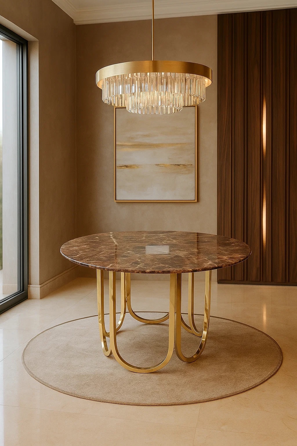 Стол обеденный Лори F-1386-1.1 — это элегантное сочетание тёплых оттенков, прочных материалов и продуманной формы. Этот обеденный дизайнерский стол станет ярким акцентом в интерьере вашей столовой или кухни, подчеркивая хороший вкус и любовь к деталям. Модель выполнена в круглой форме, что делает её удобной для размещения от 4 до 6 человек. Отсутствие углов обеспечивает комфортную посадку и безопасность даже в доме с детьми. Диаметр 122 см позволяет использовать стол как для повседневных завтраков, так и для торжественных ужинов. Особое внимание привлекает столешница из мраморного стекла (10 мм) цвета коричневый мрамор — материал, имитирующий благородную текстуру натурального камня. Поверхность устойчива к царапинам, загрязнениям и перепадам температур, а также легко очищается, сохраняя свой внешний вид на долгие годы. Теплый коричневый оттенок придает интерьеру уюта и создает ощущение тепла и роскоши. Каркас изготовлен из прочной нержавеющей стали цвета глянцевое золото, которая не только выдерживает высокие нагрузки, но и добавляет изделию декоративной выразительности. Контраст между насыщенным цветом столешницы и золотыми опорами создает эффект современной элегантности. Этот круглый обеденный стол для кухни или столовой органично впишется в разные стили интерьера: от шебби-шика до гламурного лофта и современной классики. Столешница: мраморное стекло 10 мм, цвет: коричневый мрамор Основание: нержавеющая сталь, глянцевое золото 122х122х76 см Страна производитель: Китай Гарантия 1 год