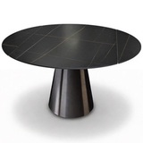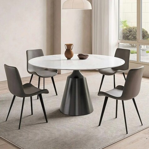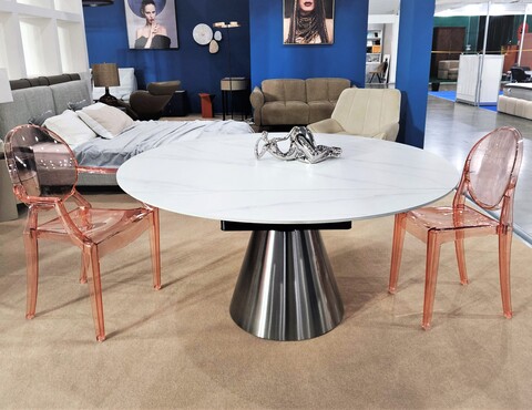 Столешница из керамогранита не требует тщательного ухода и обладает высокой прочностью. Изящная форма и светлая поверхность помогают визуально увеличить пространство, а эффектные опоры подчеркивают особую композицию стола.